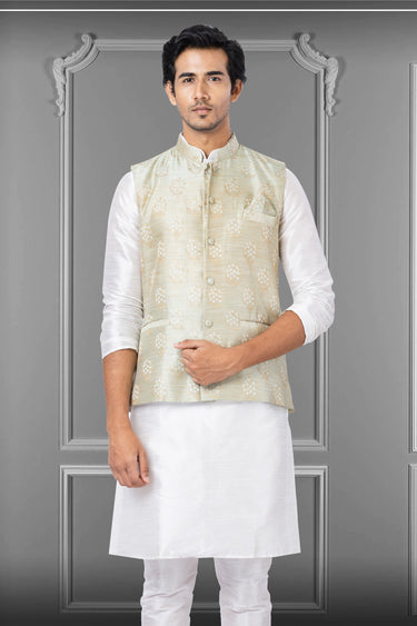 Beige Sangeet Wear Readymade Lovely Jacquard Silk Fabric Jacket For Men