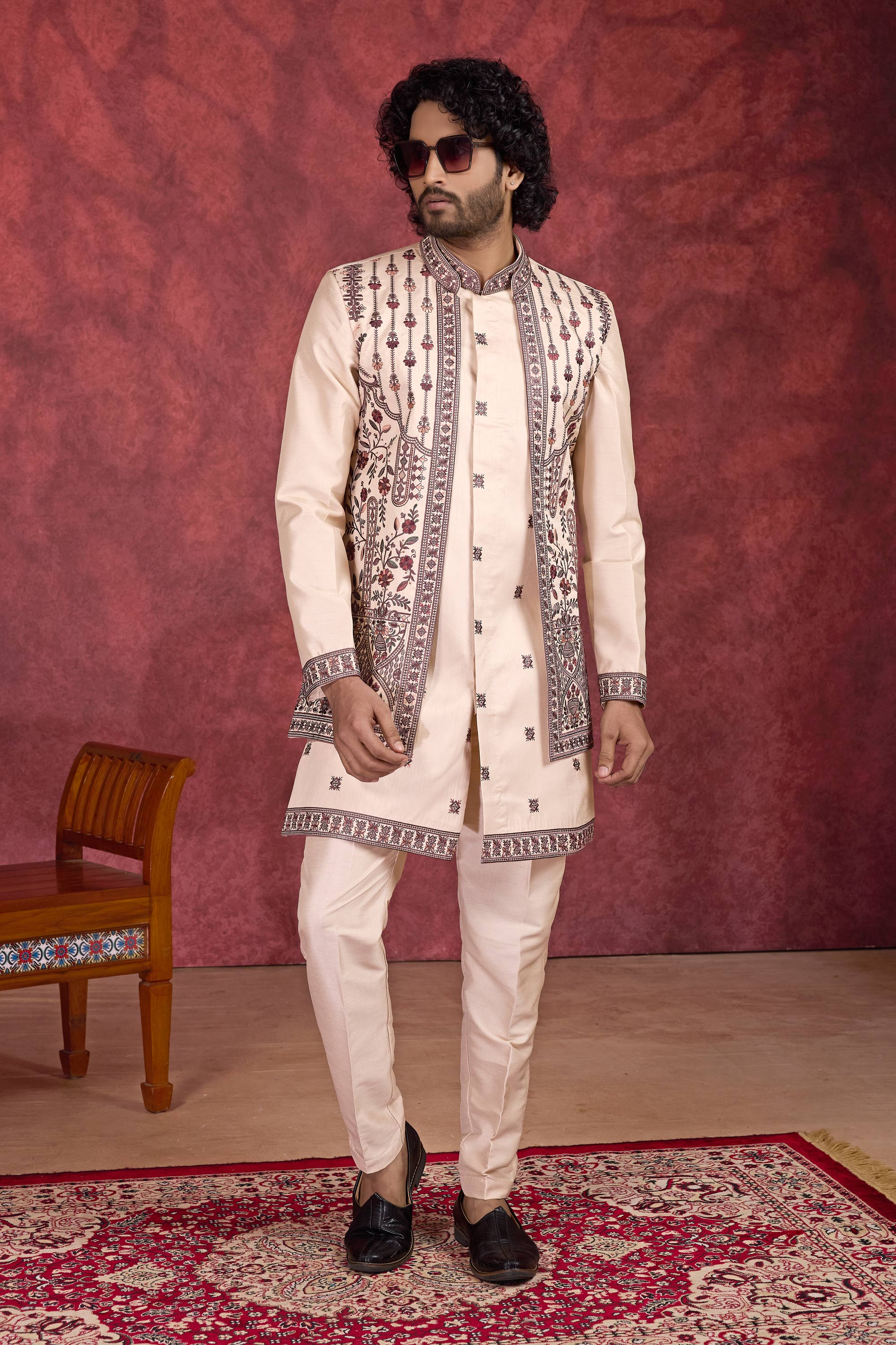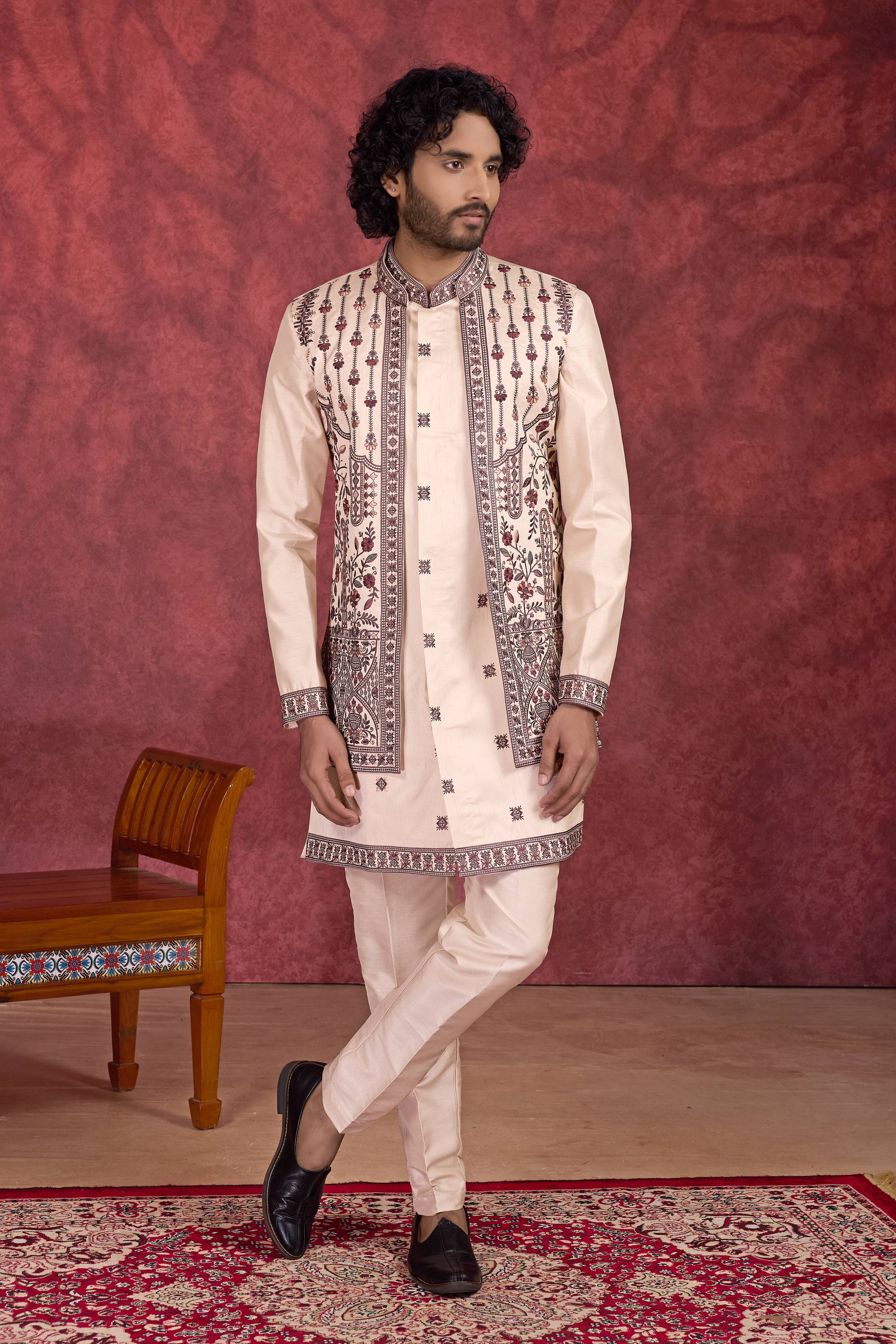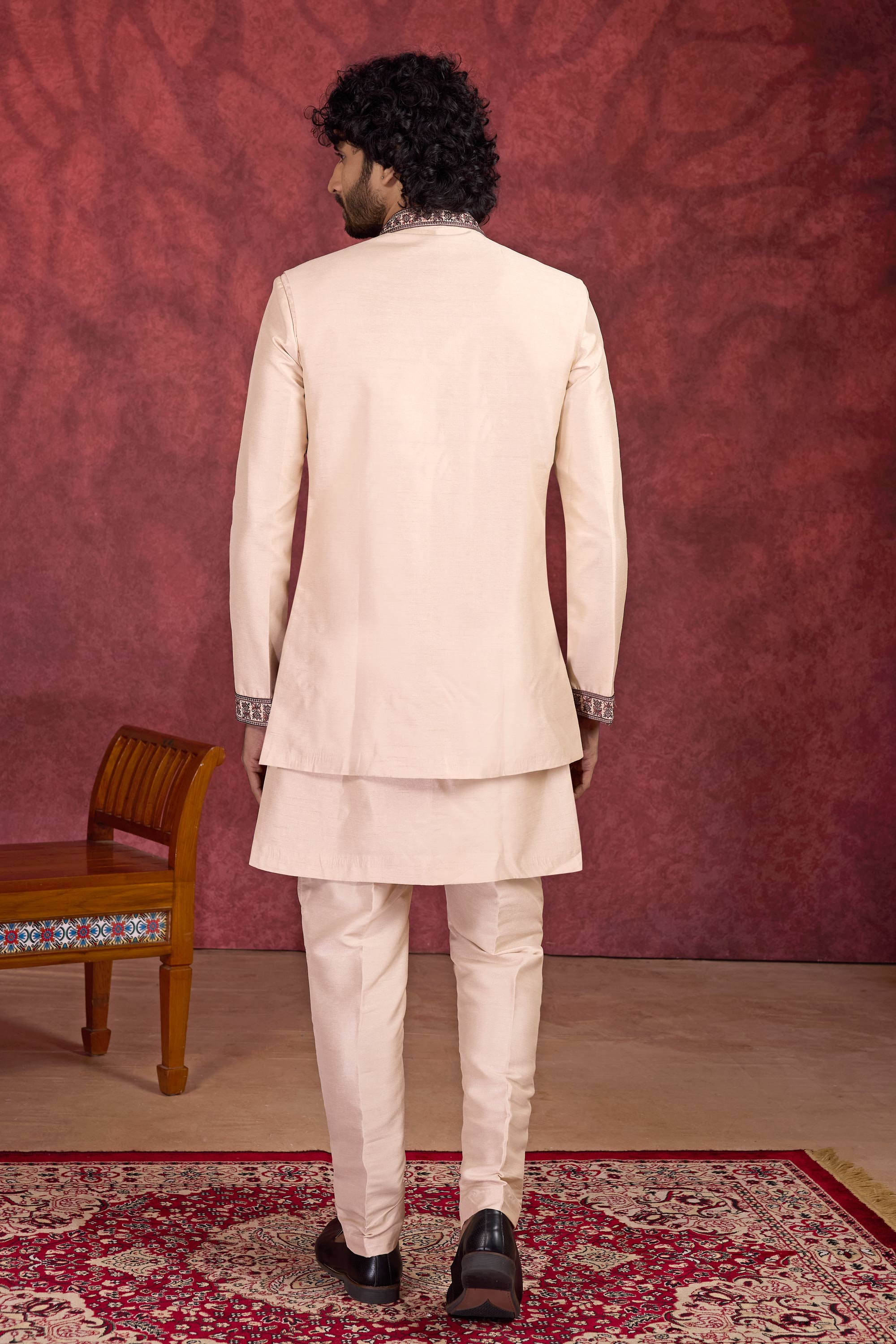 Embroidered Peach Function Wear Kurta Pyjama With Jacket For Men