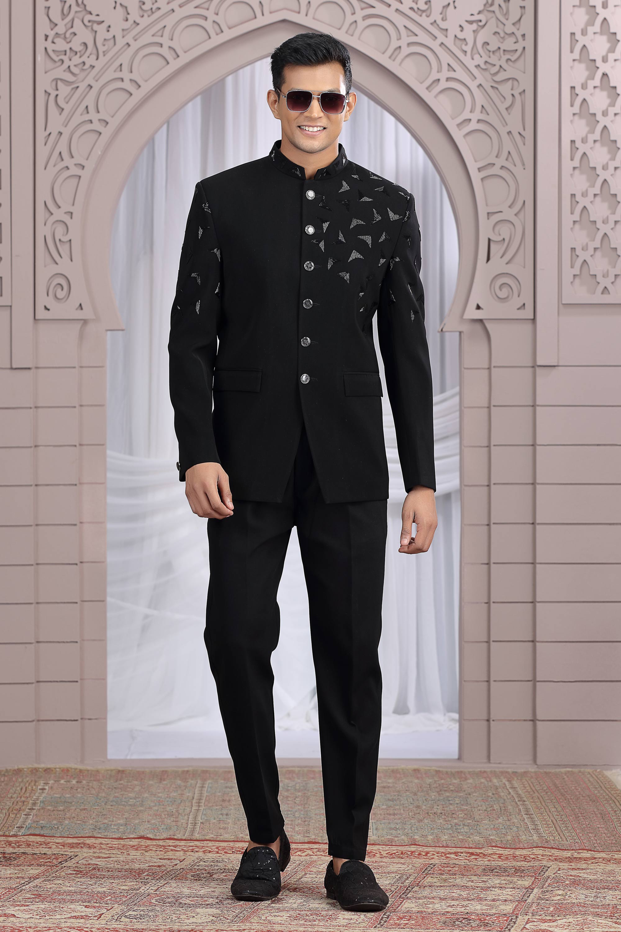 Fancy Fabric Black Sangeet Wear Readymade Men Stylish Indo Western Jodhpuri Suit