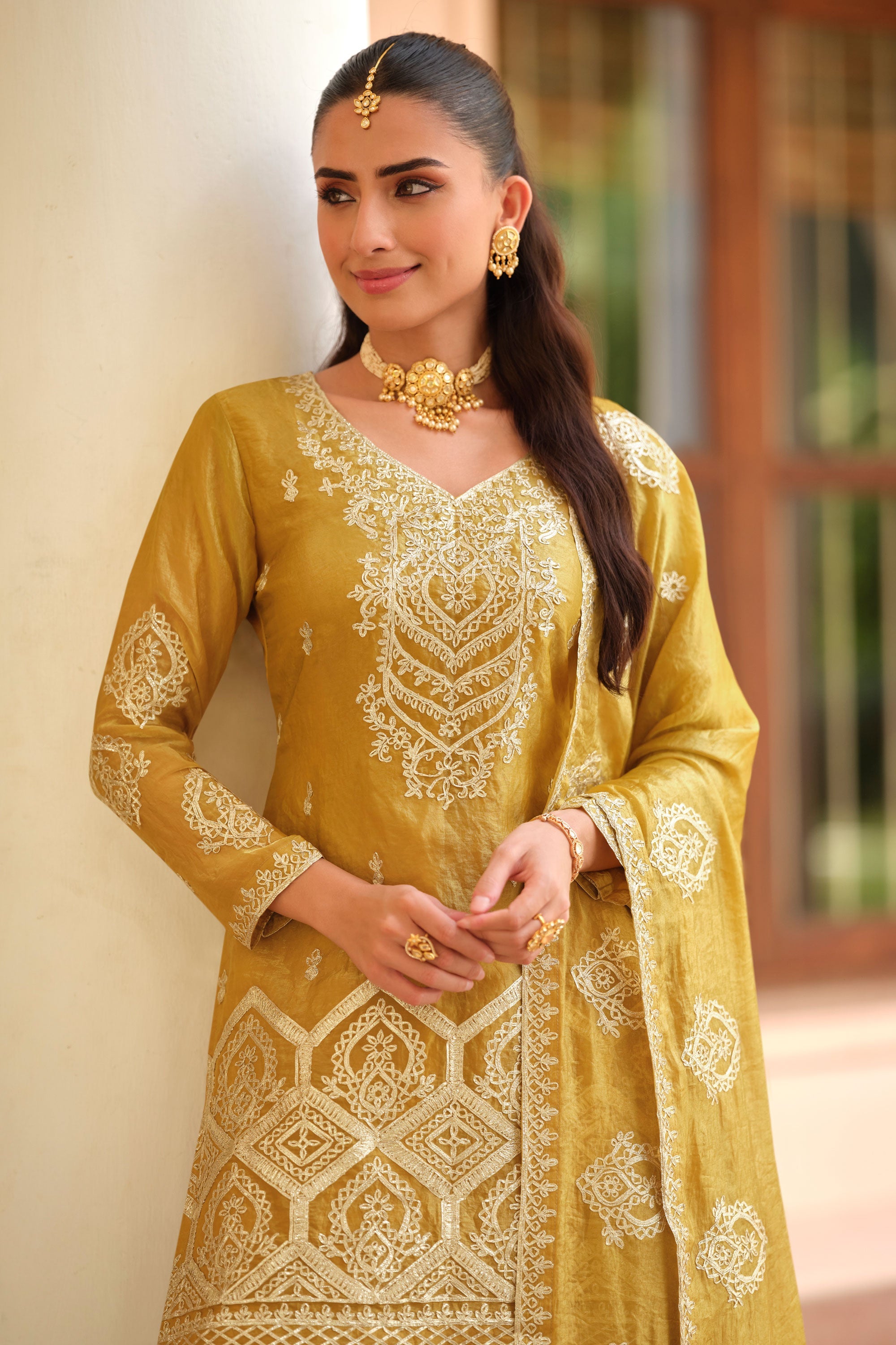 Art Silk Mustard Embroidered Readymade Palazzo Salwar Suit
