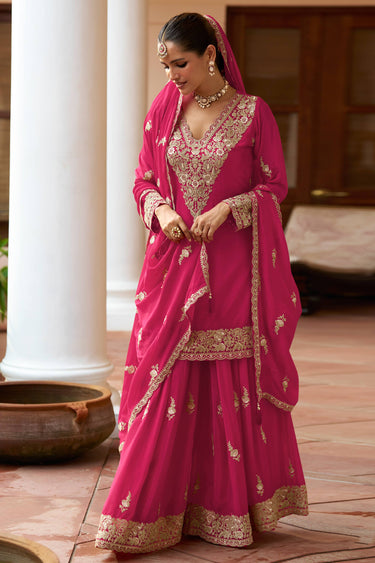 Upgrade your wardrobe with this exquisite Chinon fabric readymade palazzo salwar suit. Designed for style and comfort, this outfit features intricate embroidery that adds a touch of sophistication to your look. Whether you're attending a festive celebration or an intimate gathering, its lightweight material ensures all-day ease. Perfect for formal events or casual outings, this ensemble blends modern fashion with traditional craftsmanship. Make a statement effortlessly with its versatile appeal.