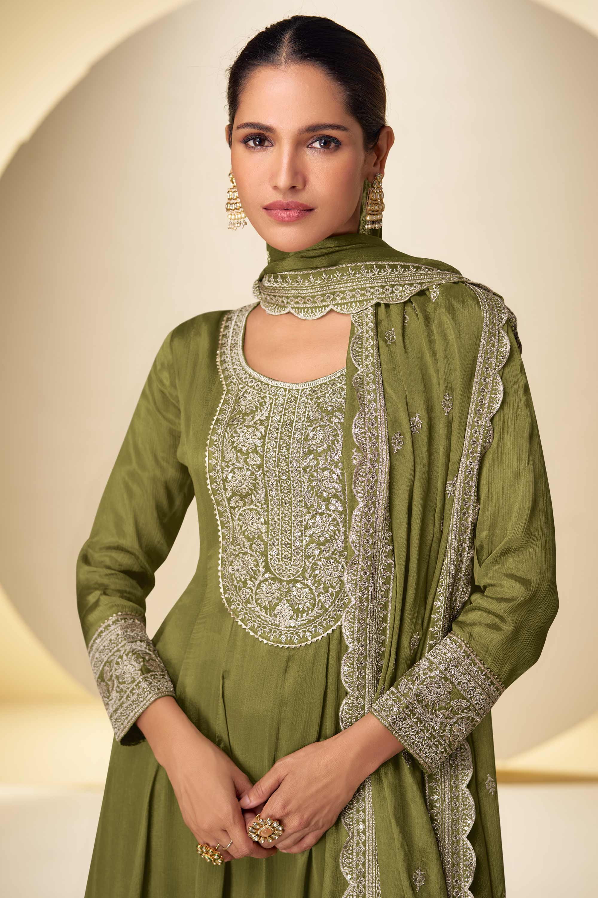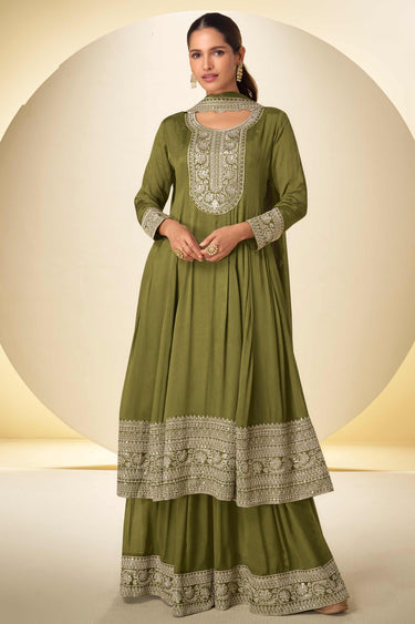 Olive Chinon Embroidered Readymade Palazzo Salwar Kameez