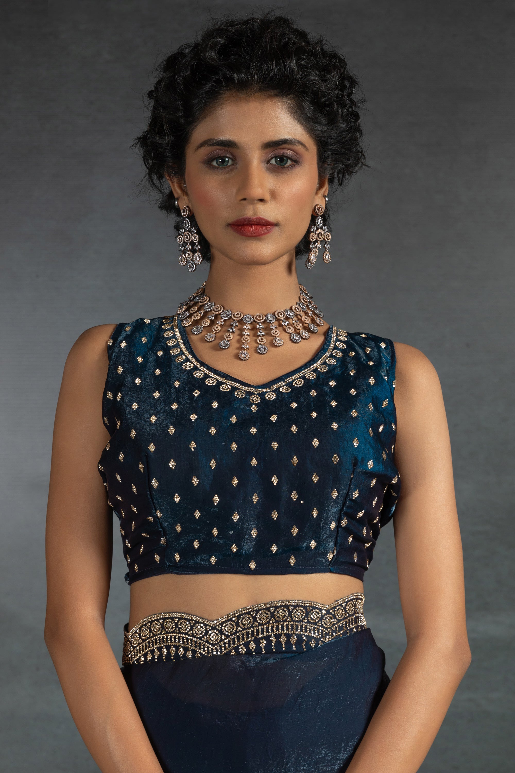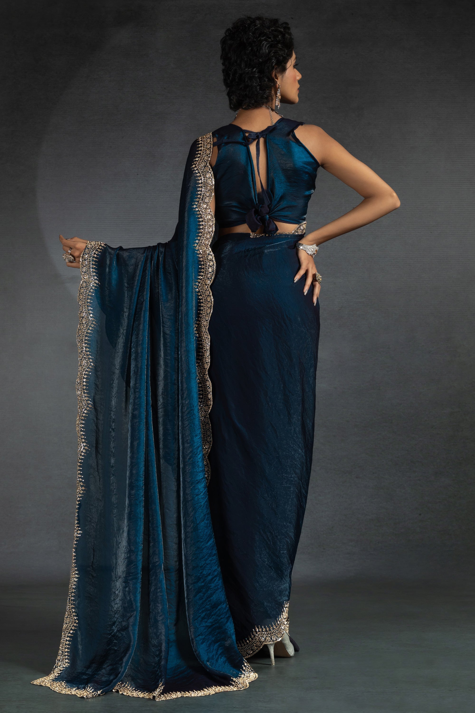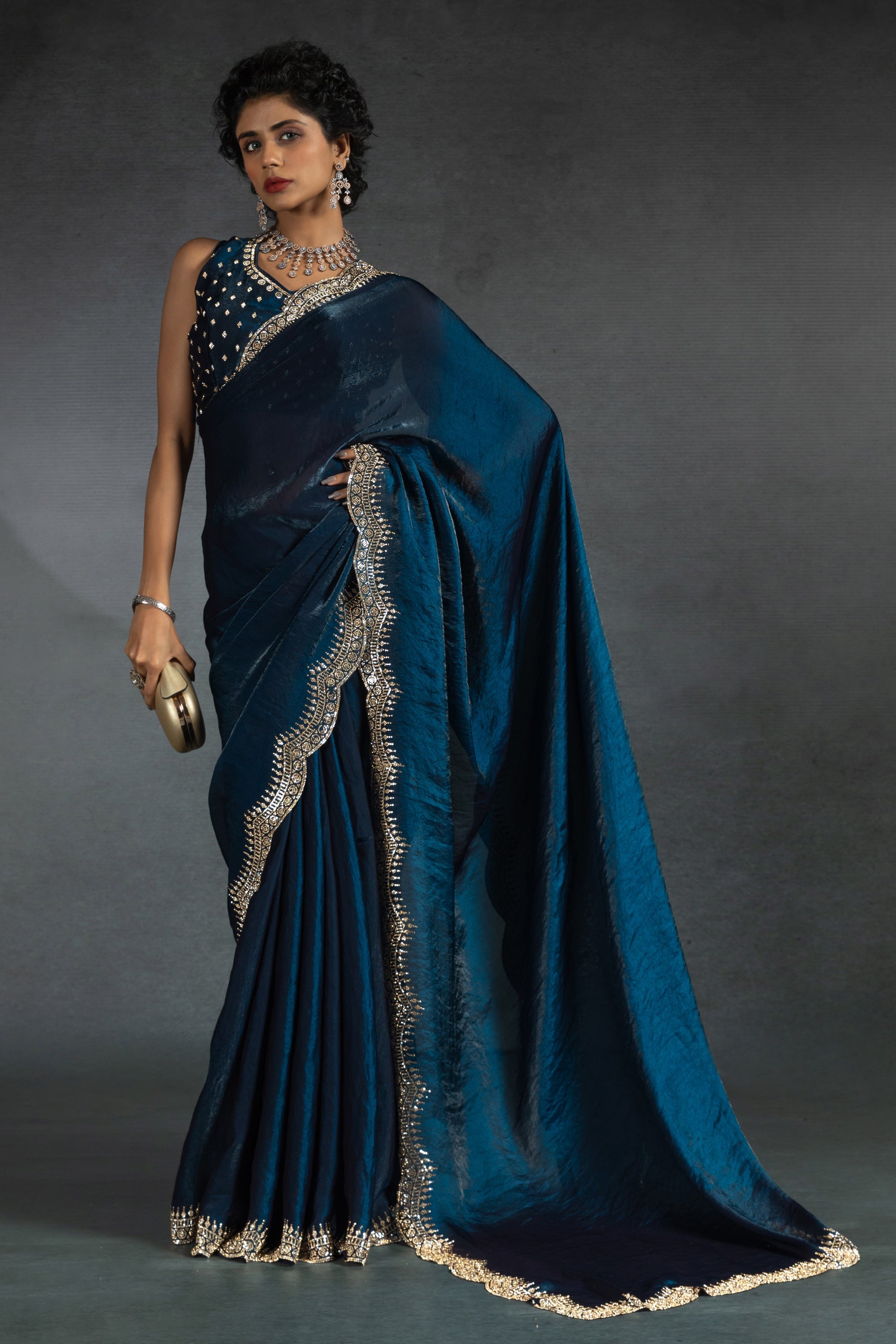 Navy Blue Satin Silk Stone Border Work Party Wear Saree