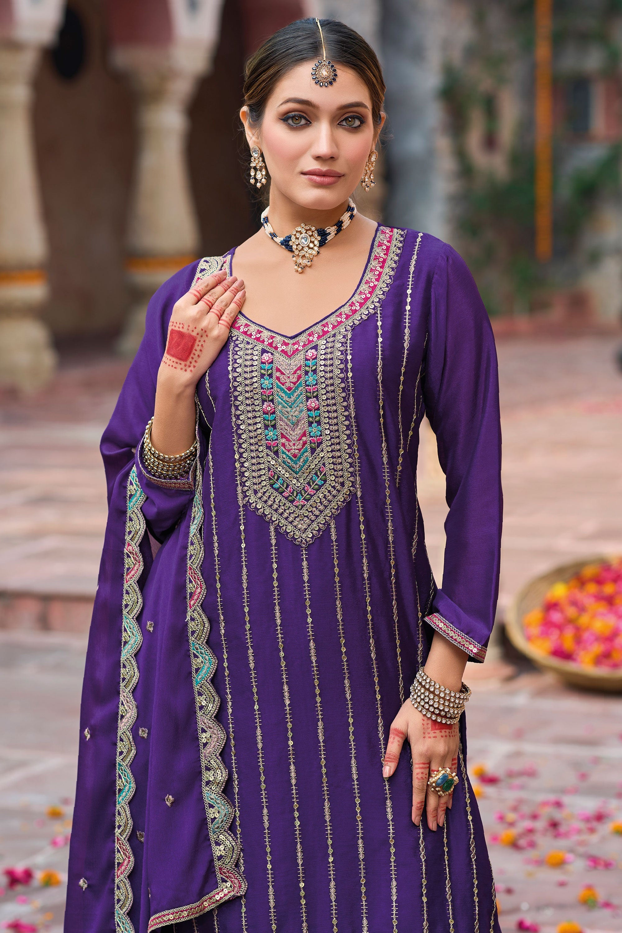 Turn heads with the timeless beauty of the Chinon Embroidered Rich Color Designer Palazzo Salwar Kameez. Perfectly crafted for traditional events, its fine detailing and vivid tones make it an ideal pick for functions, festivals, and weddings. The flowy palazzo style adds comfort to its classic appeal. This versatile attire pairs wonderfully with elegant jewelry, creating a graceful ensemble for memorable moments. Recommended care: dry clean only. Note: Colors may vary slightly.
