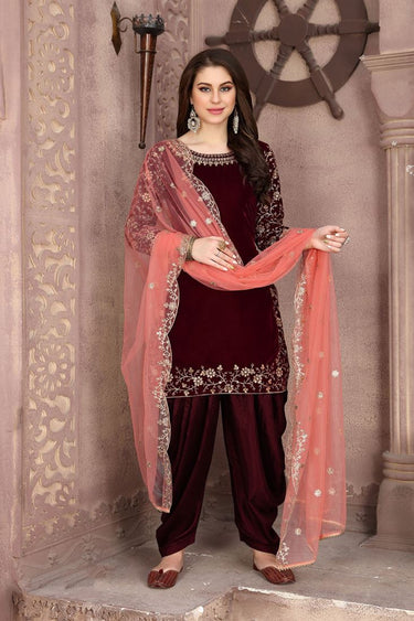 Occasion Wear Velvet Fabric Embroidered Patiala Salwar Kameez In Maroon