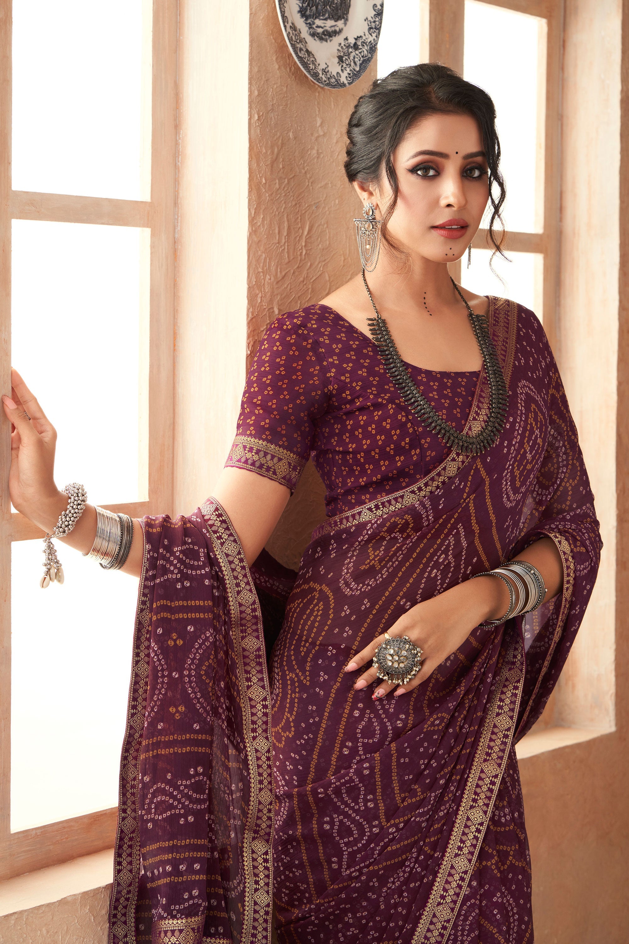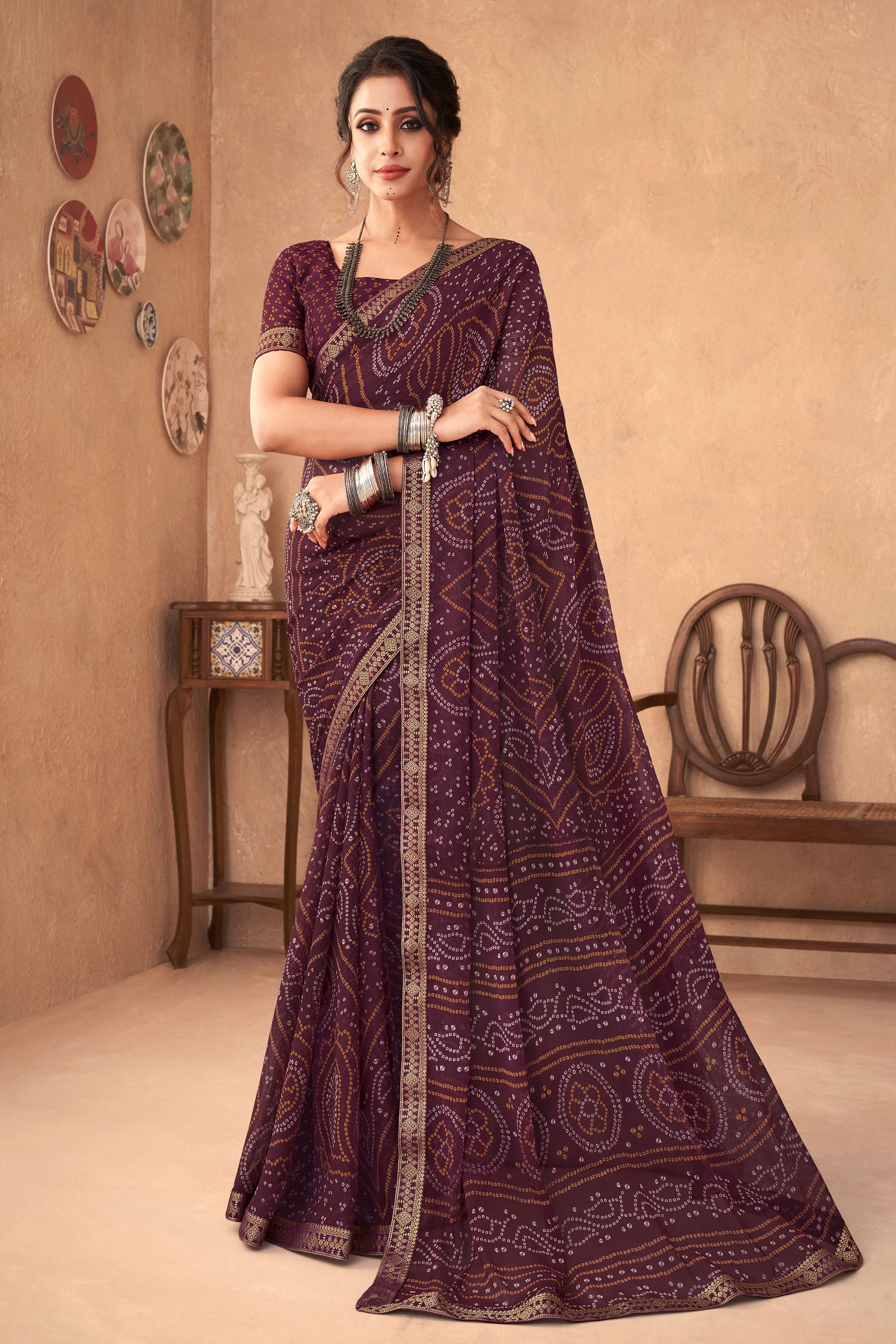 Turn your everyday moments into special ones with this beautifully designed Bandhani Print Saree. Featuring an attached Banarasi border, this chiffon saree brings a traditional feel with modern flair. It comes with matching blouse material, allowing you to customize your fit and look. Ideal for casual occasions, it offers lightweight fabric for all-day wear without compromising on style. Whether you're heading to work or running errands, this saree combines tradition with functionality to keep you comfortable and elegant.