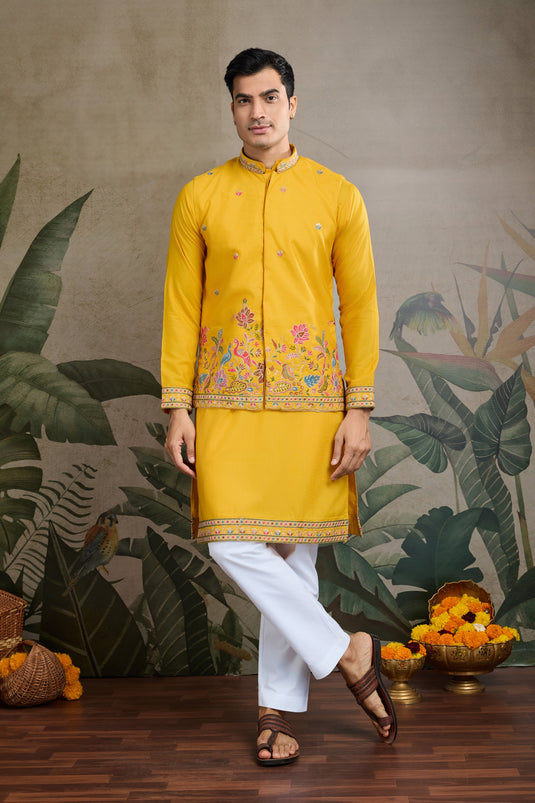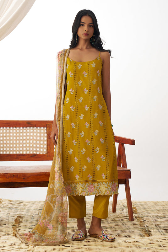 €64,95 EUR€128,95 EUR Original Price Save 50%/ Art Silk Mustard Embroidered Readymade Palazzo Salwar SuitSave 50%
