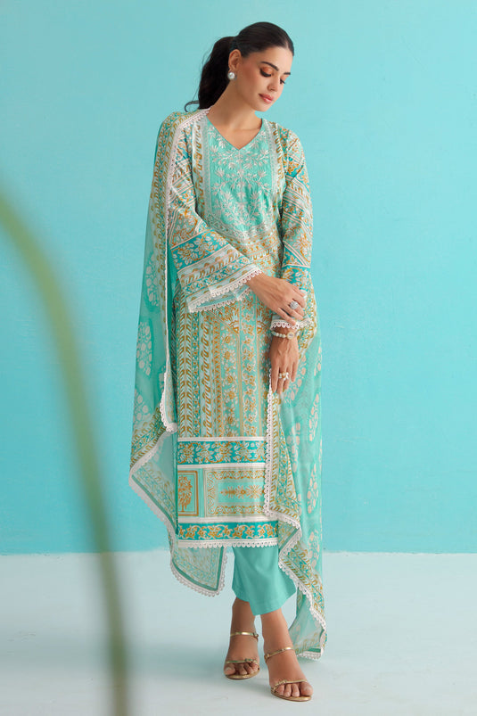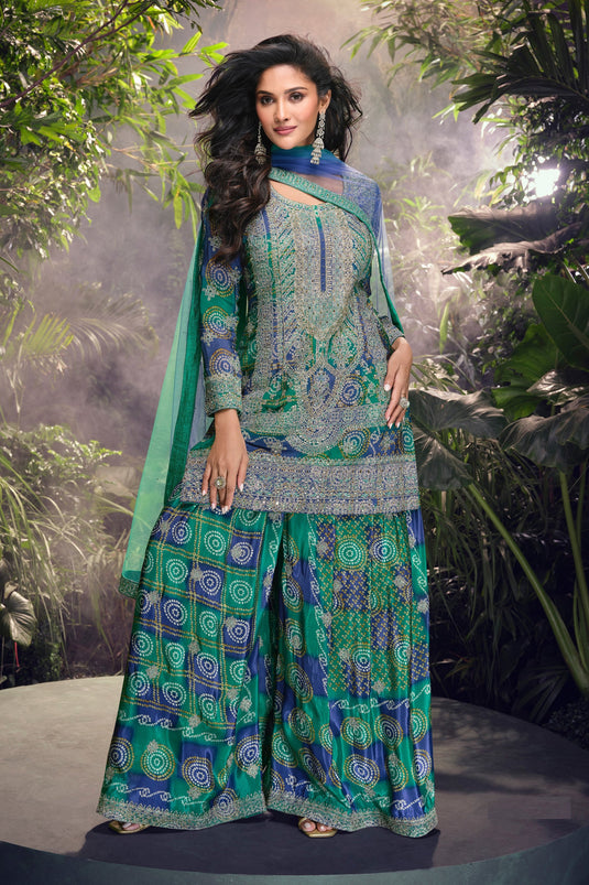 €68,95 EUR€137,95 EUR Original Price Save 50%/ Cyan Chinon Embroidered Readymade Palazzo Salwar KameezSave 50%