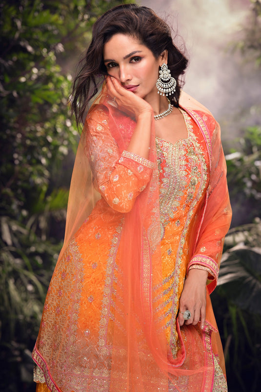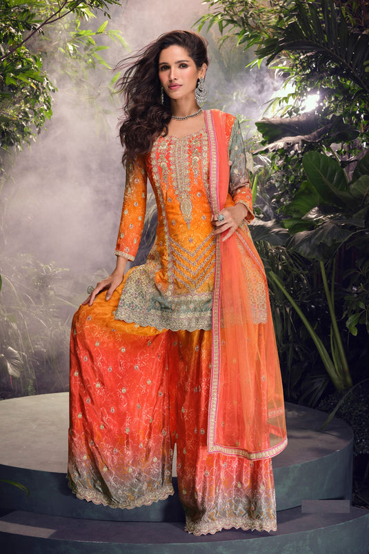 €64,95 EUR€128,95 EUR Original Price Save 50%/ Chinon Silk Orange Readymade Palazzo Set With Neck Dupatta-