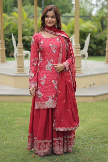 Chinon Fabric Red Color Readymade Palazzo Salwar Suit