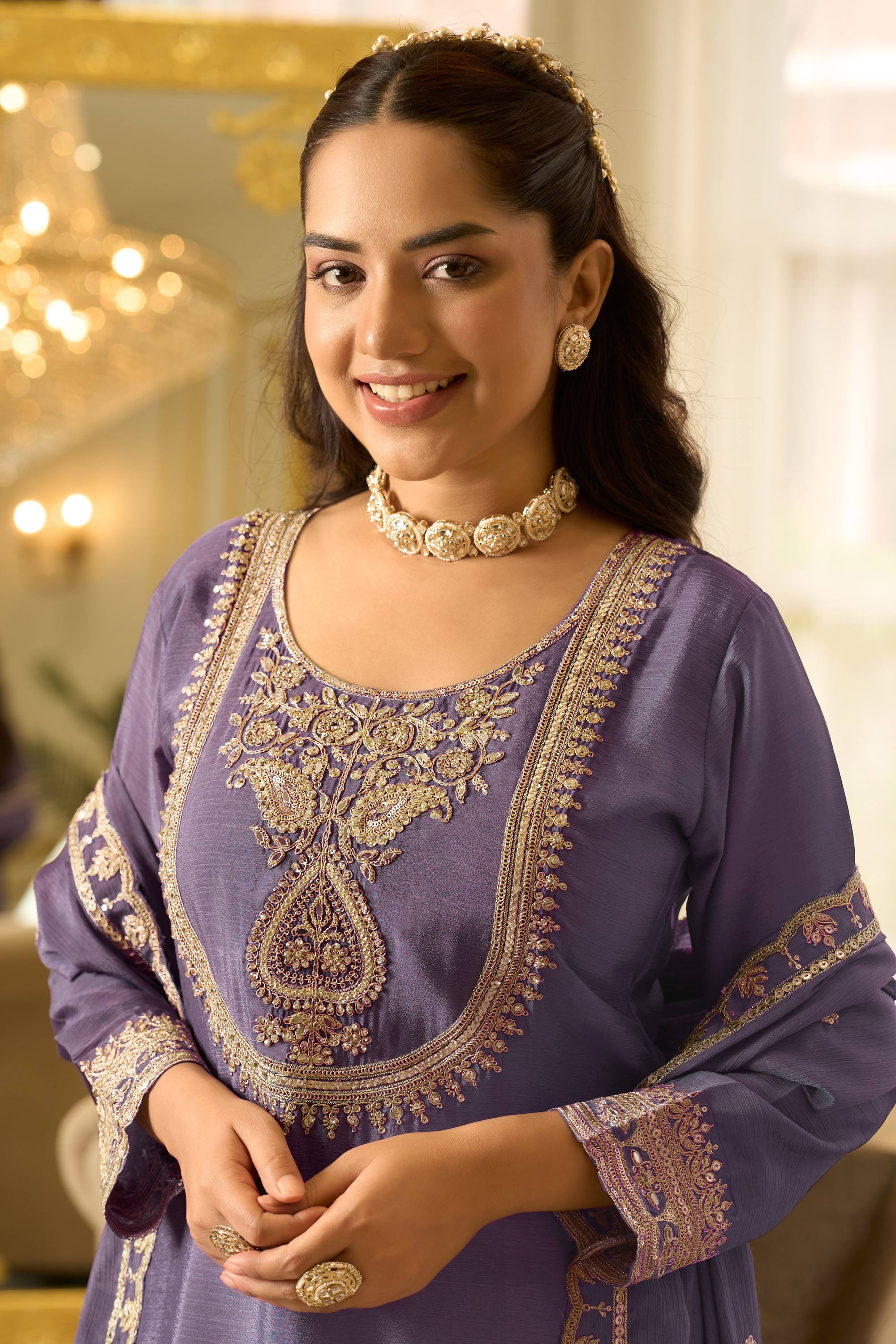 Chinon Silk Embroidered Purple Readymade Palazzo Suit For Wedding Wear