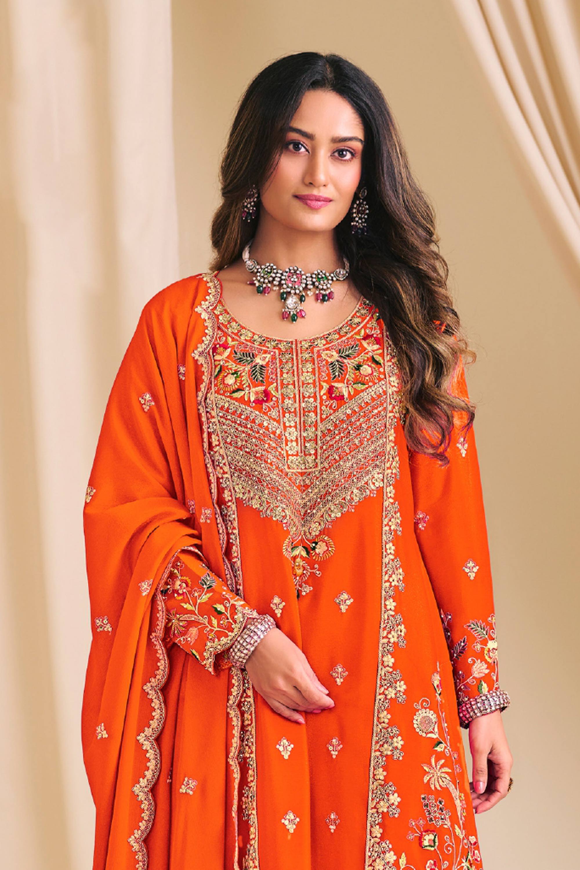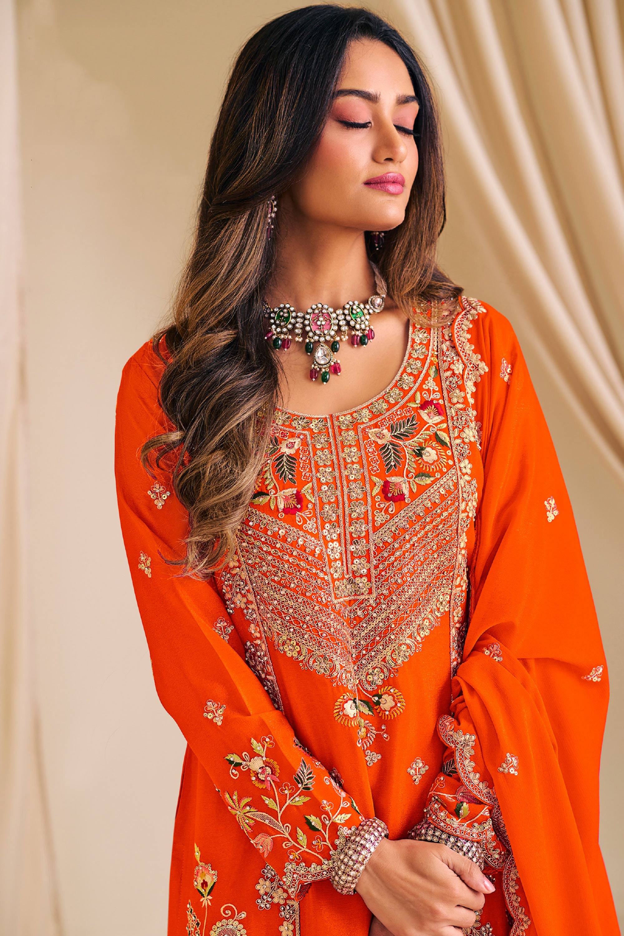 Embroidered Chinon Orange Readymade Palazzo Suit For Sangeet Wear