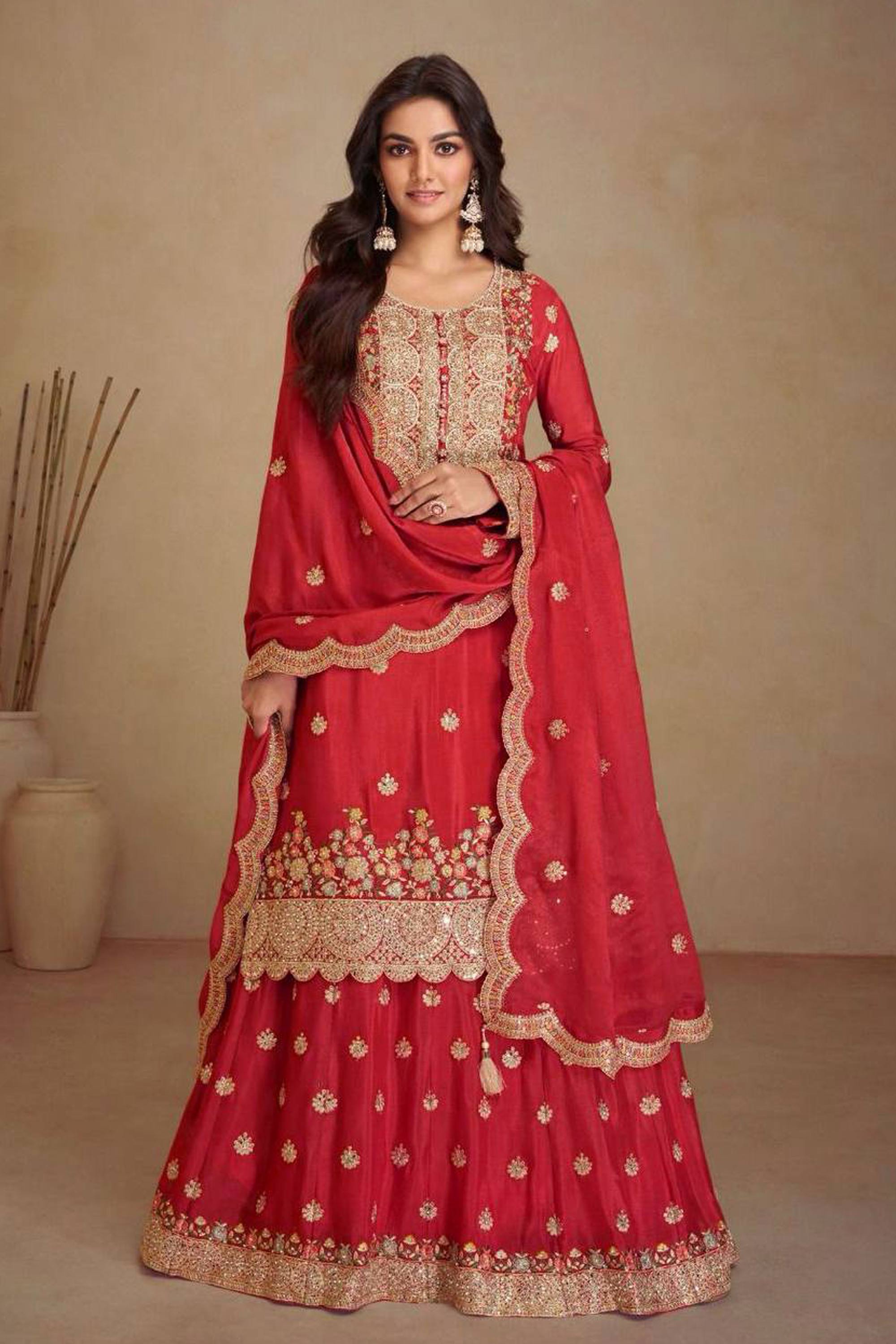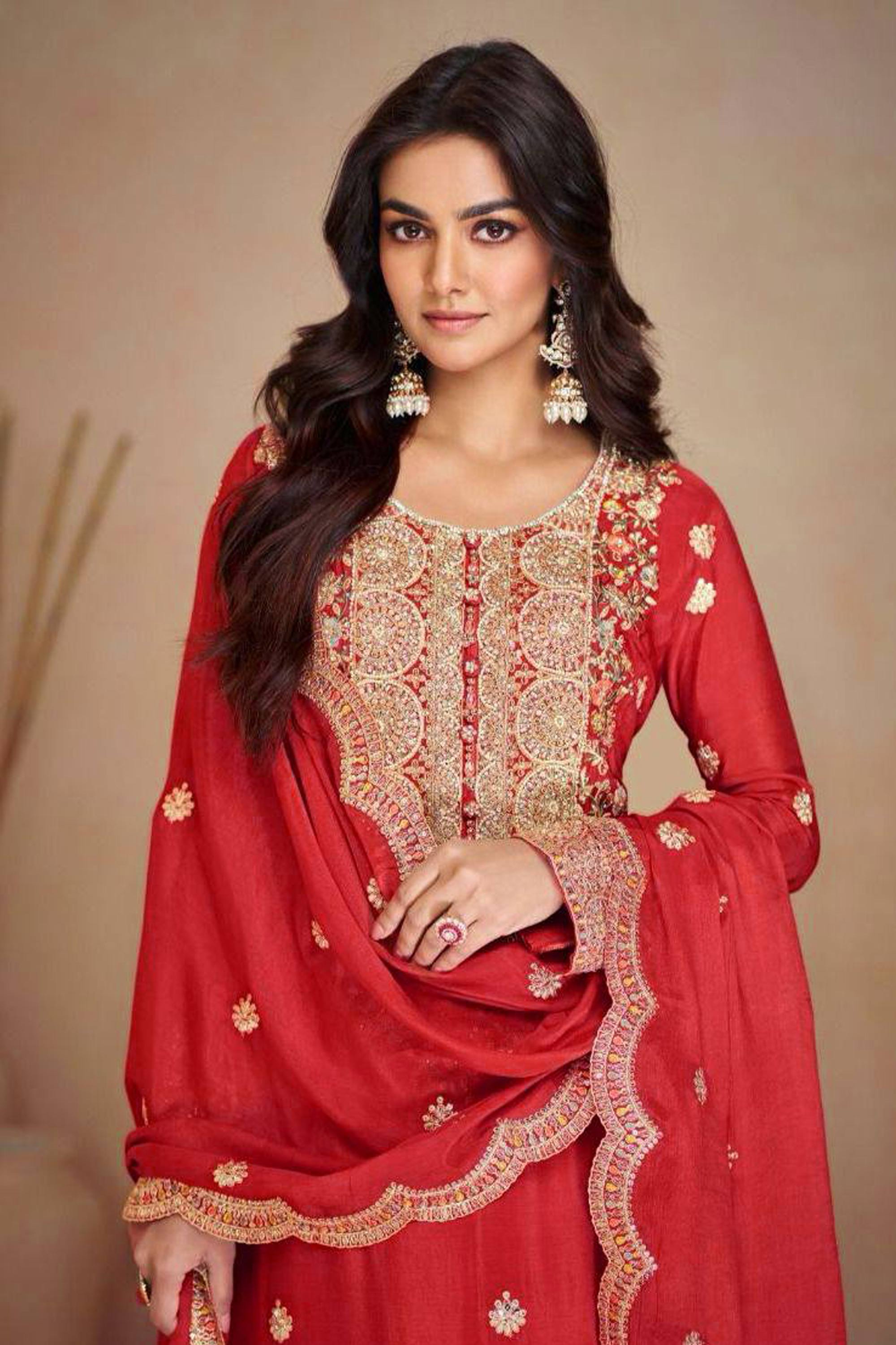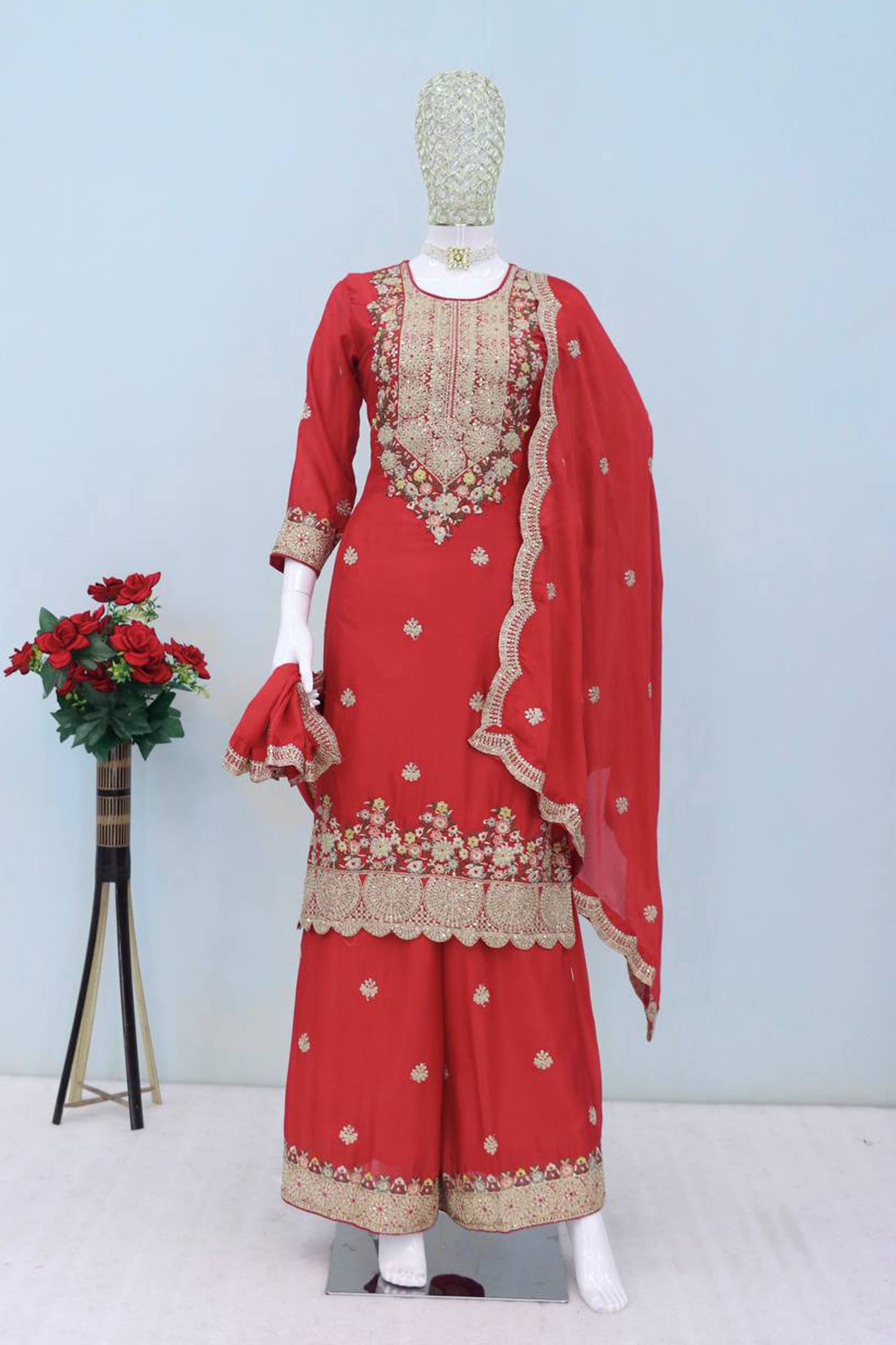 Red Festive Wear Chinon Embroidered Readymade Palazzo Suit