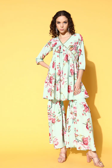 Exclusive Sea Green Color Crepe Fabric Casual Wear Printed Readymade Top With Bottom Set