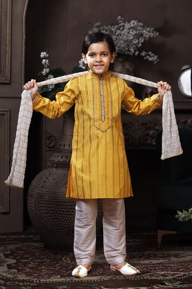 Yellow Color Cotton Fabric Printed Sangeet Wear Readymade Boys Kurta Pyjama
