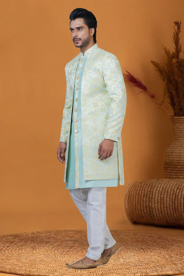 Artistic Jacquard Silk Light Cyan Readymade Jacquard Work Men Indo Western For Wedding Wear