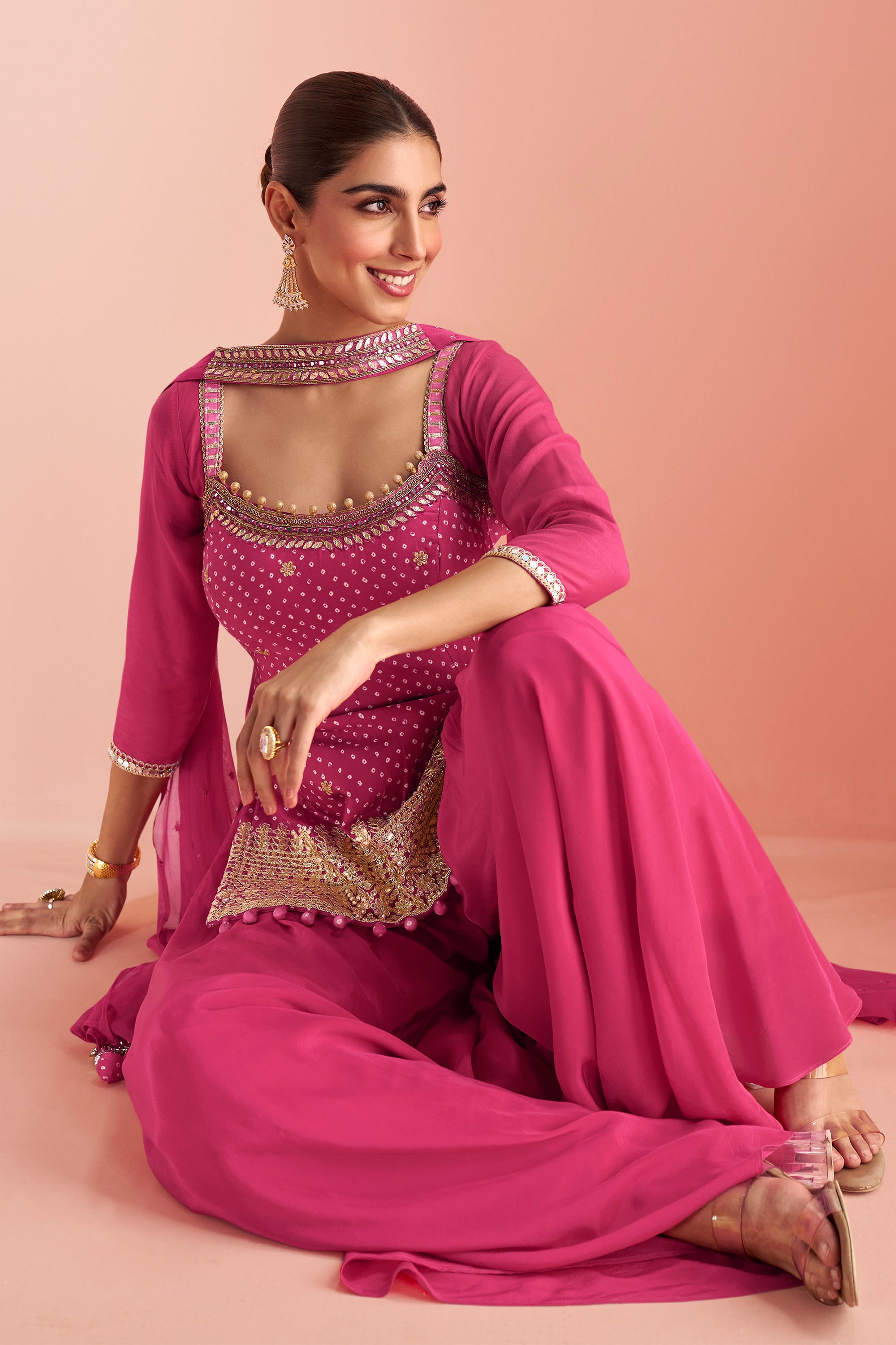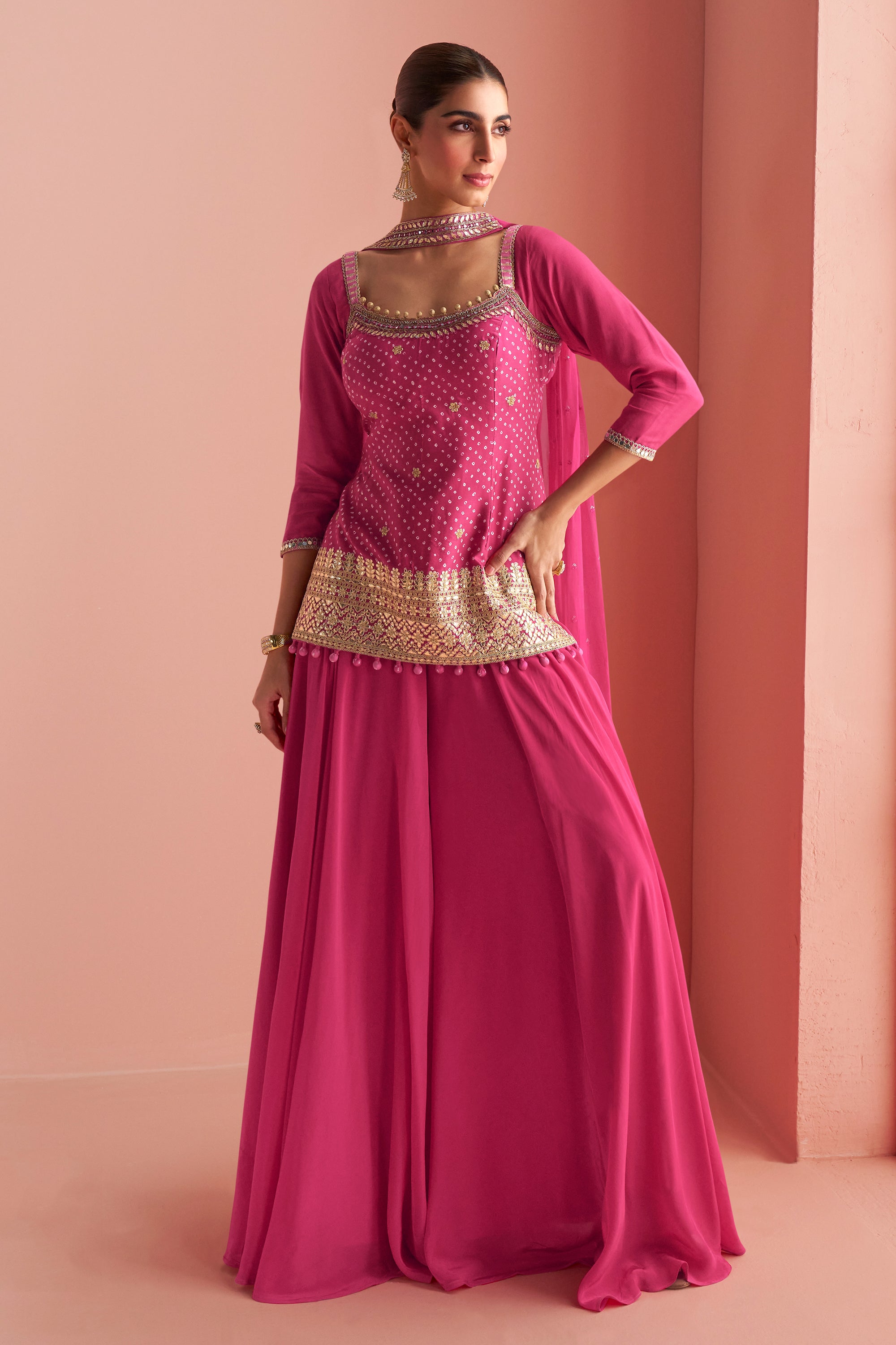 Chinon Silk Rani Embroidered Readymade Top With Palazzo Salwar Suit