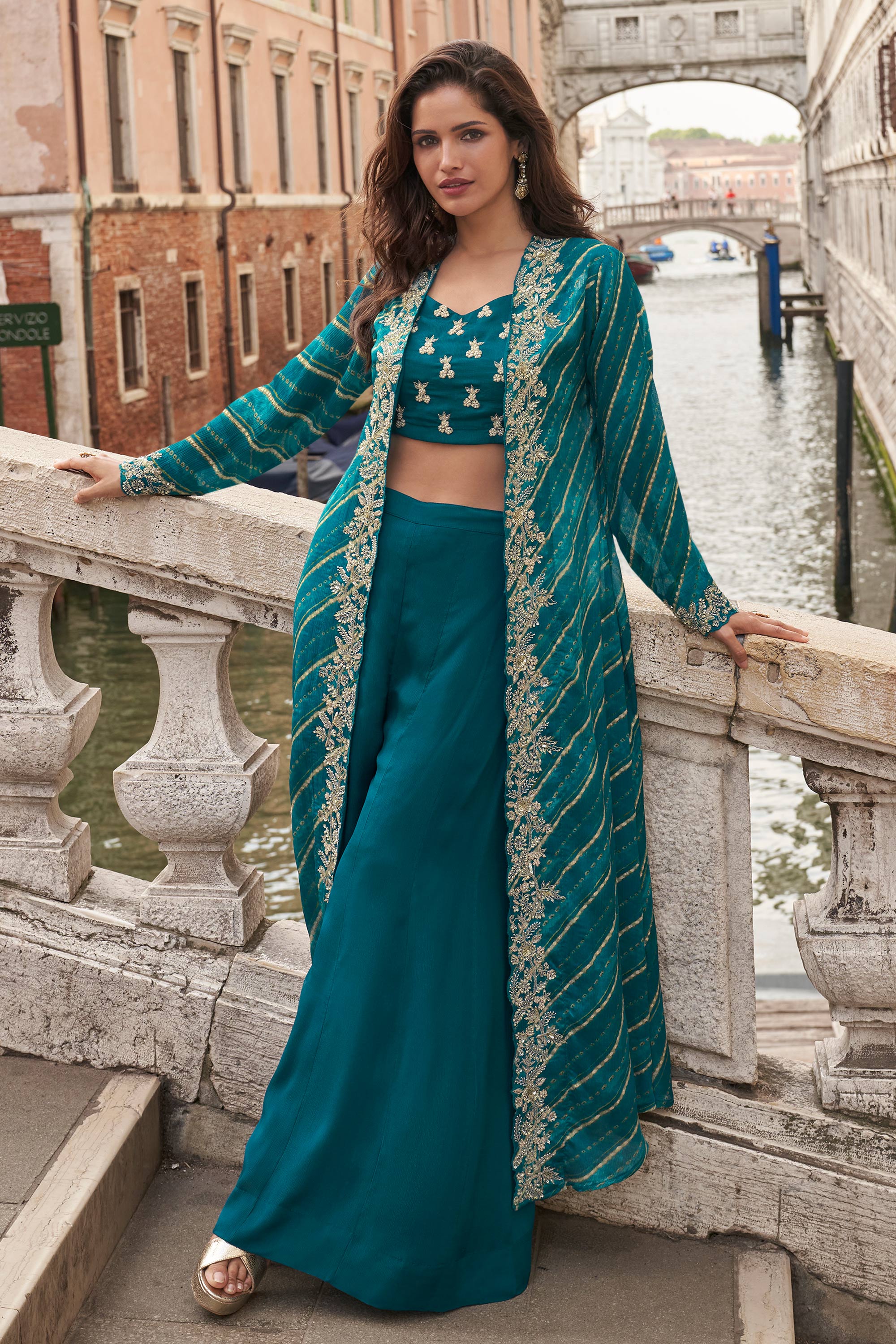 Chinon Teal Readymade Palazzo Set With Designer Blouse And Shrug For Party Wear