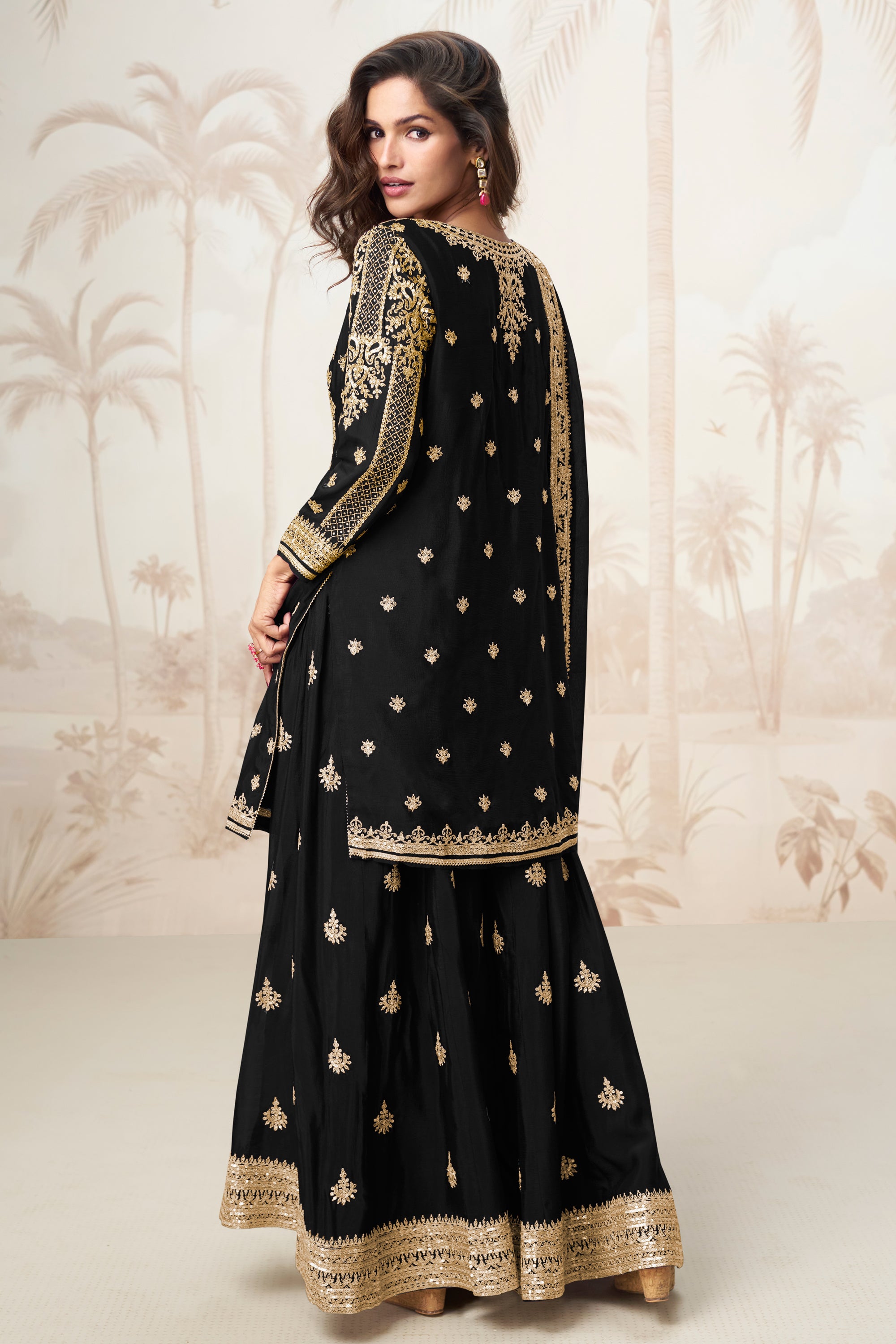Embroidered Chinon Silk Black Readymade Palazzo Suit