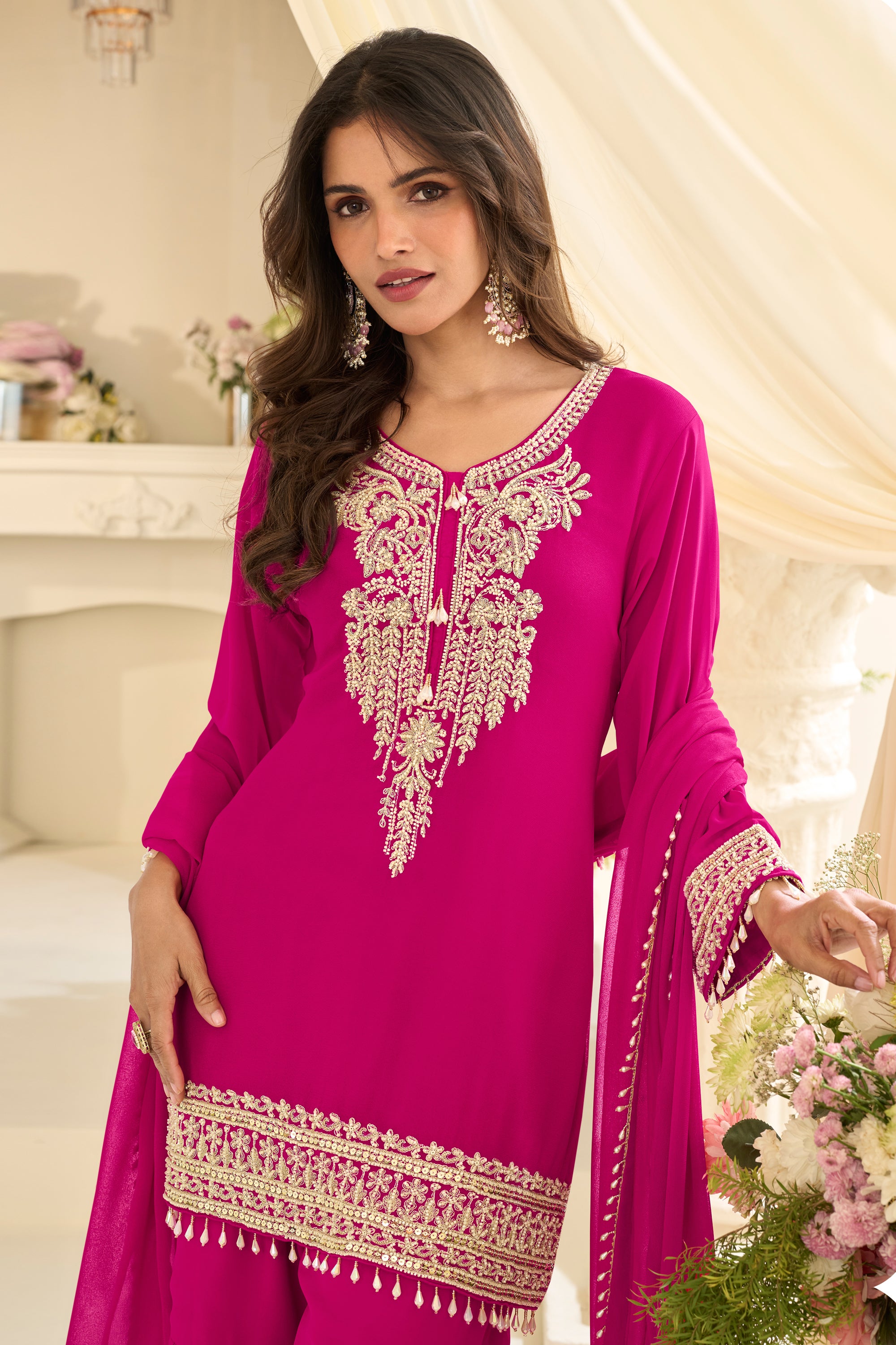 Georgette Embroidered Magenta Readymade Top With Palazzo Salwar Suit