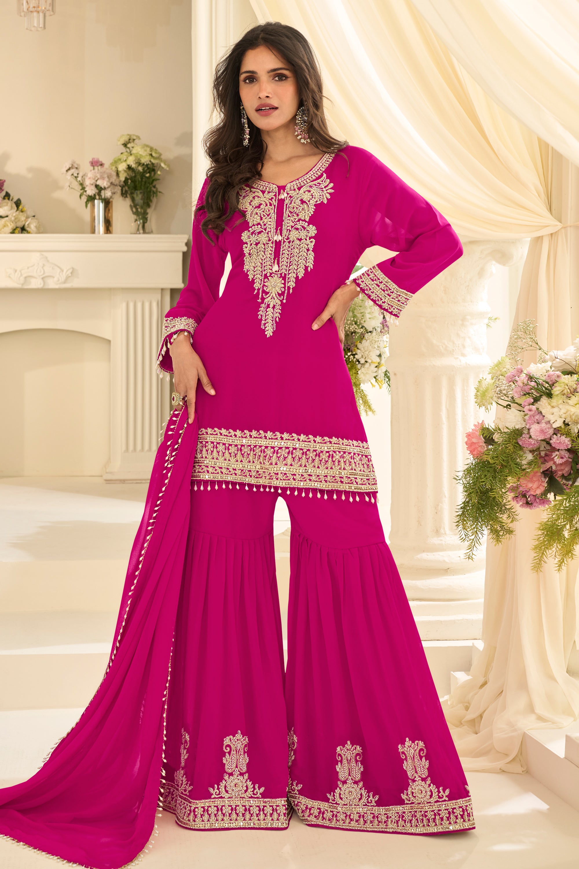 Step into style with this beautiful Georgette Embroidered Magenta Readymade Top With Palazzo Salwar Suit. Designed with detailed embroidery and tailored for an impeccable fit, this ready-to-wear suit blends traditional charm with contemporary appeal. Made with breathable georgette fabric, the set is lightweight and perfect for all-day comfort. The flattering magenta color and elegant design make it ideal for any occasion, from celebrations to family gatherings. Enhance your look effortlessly with this sophisticated and versatile ensemble.