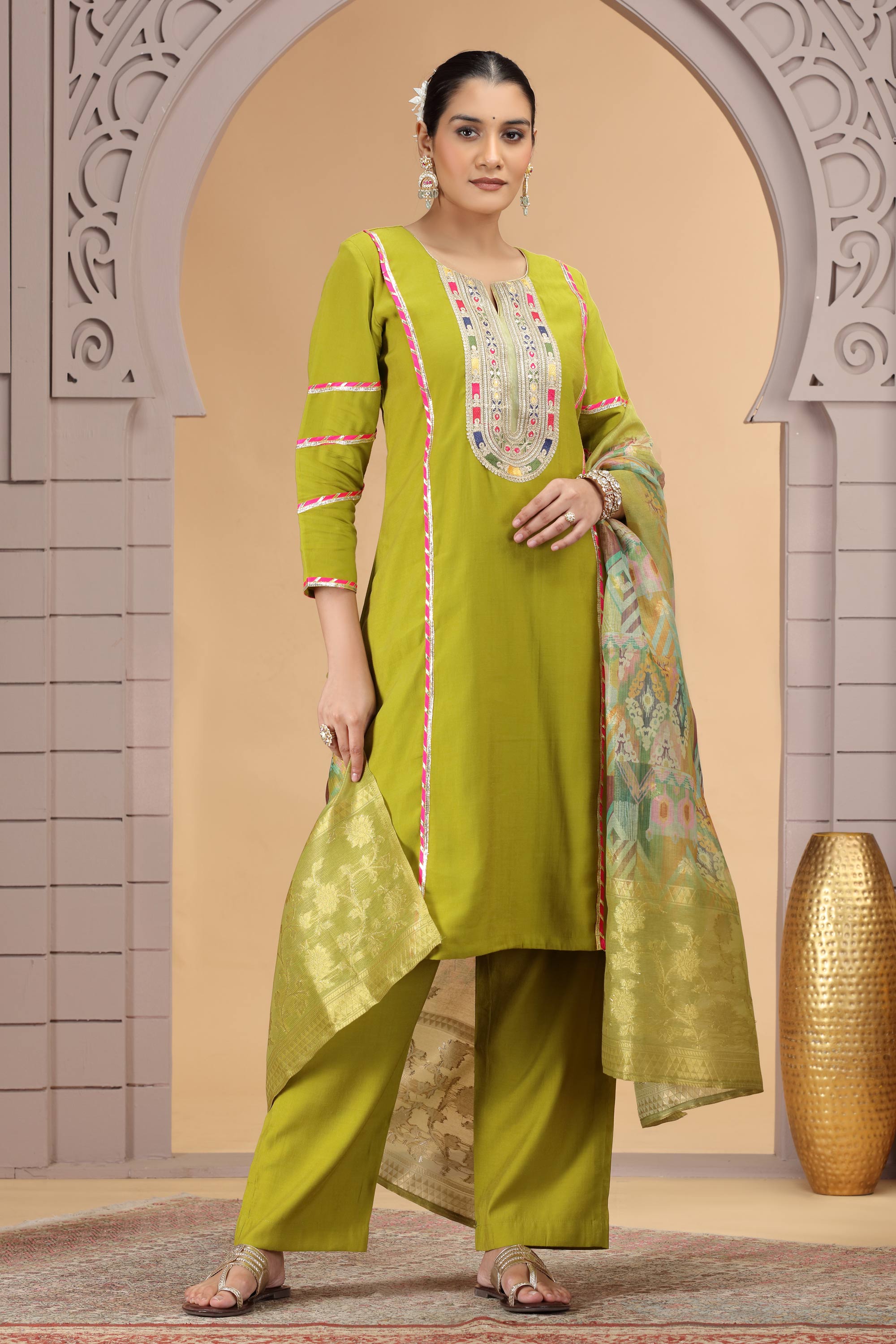 Mehendi Green Readymade Designer Salwar Kameez With Jacquard Dupatta