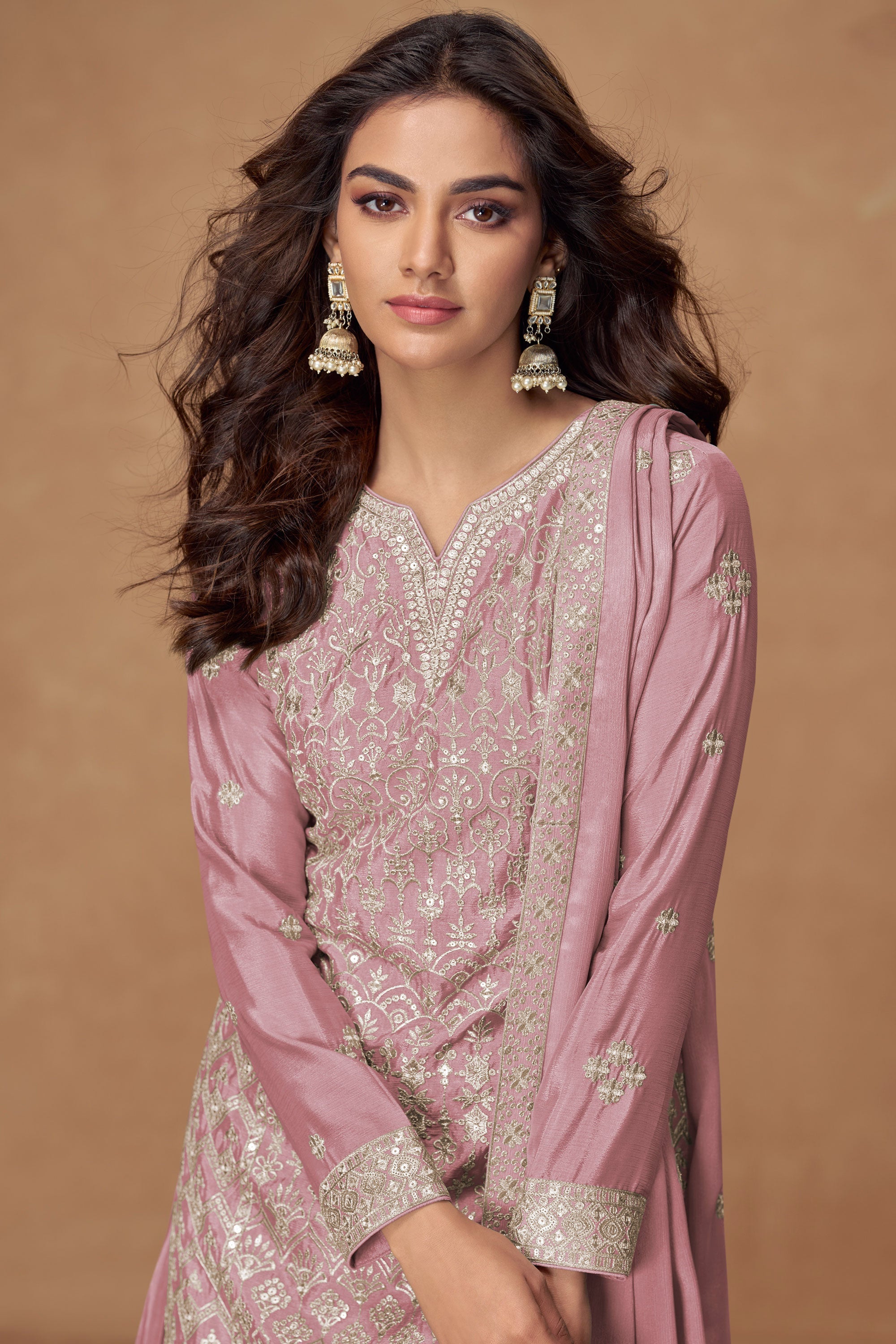 Peach Color Chinon Silk Embroidered Readymade Palazzo Salwar Kameez