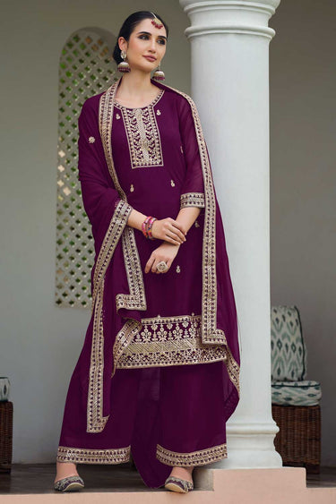 Tempting Georgette Fabric Purple Color Embroidered Palazzo Suit