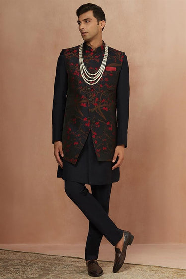 Black Gorgeous Jacquard Silk Fabric Wedding Wear Readymade Men Indo Western With Jacket