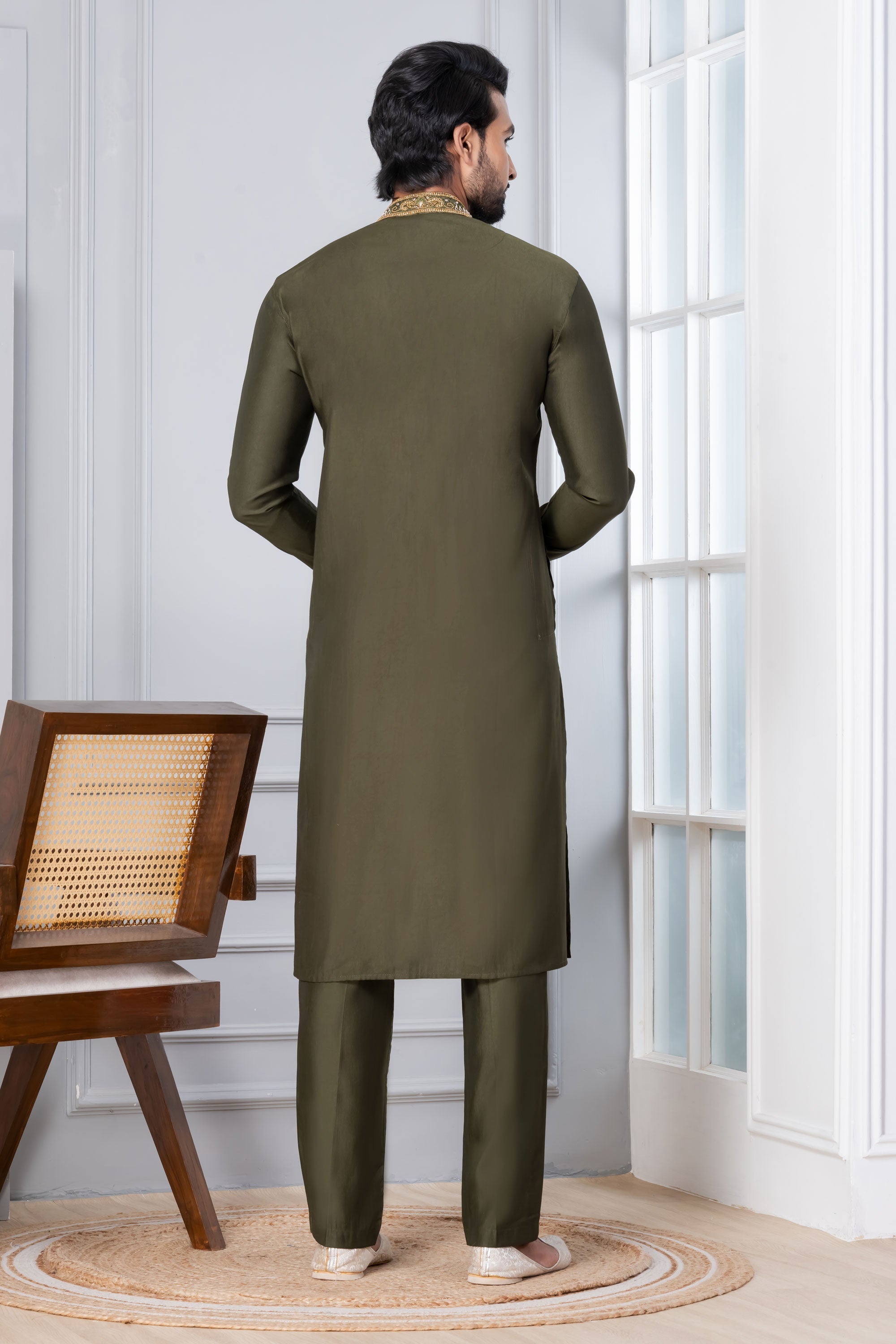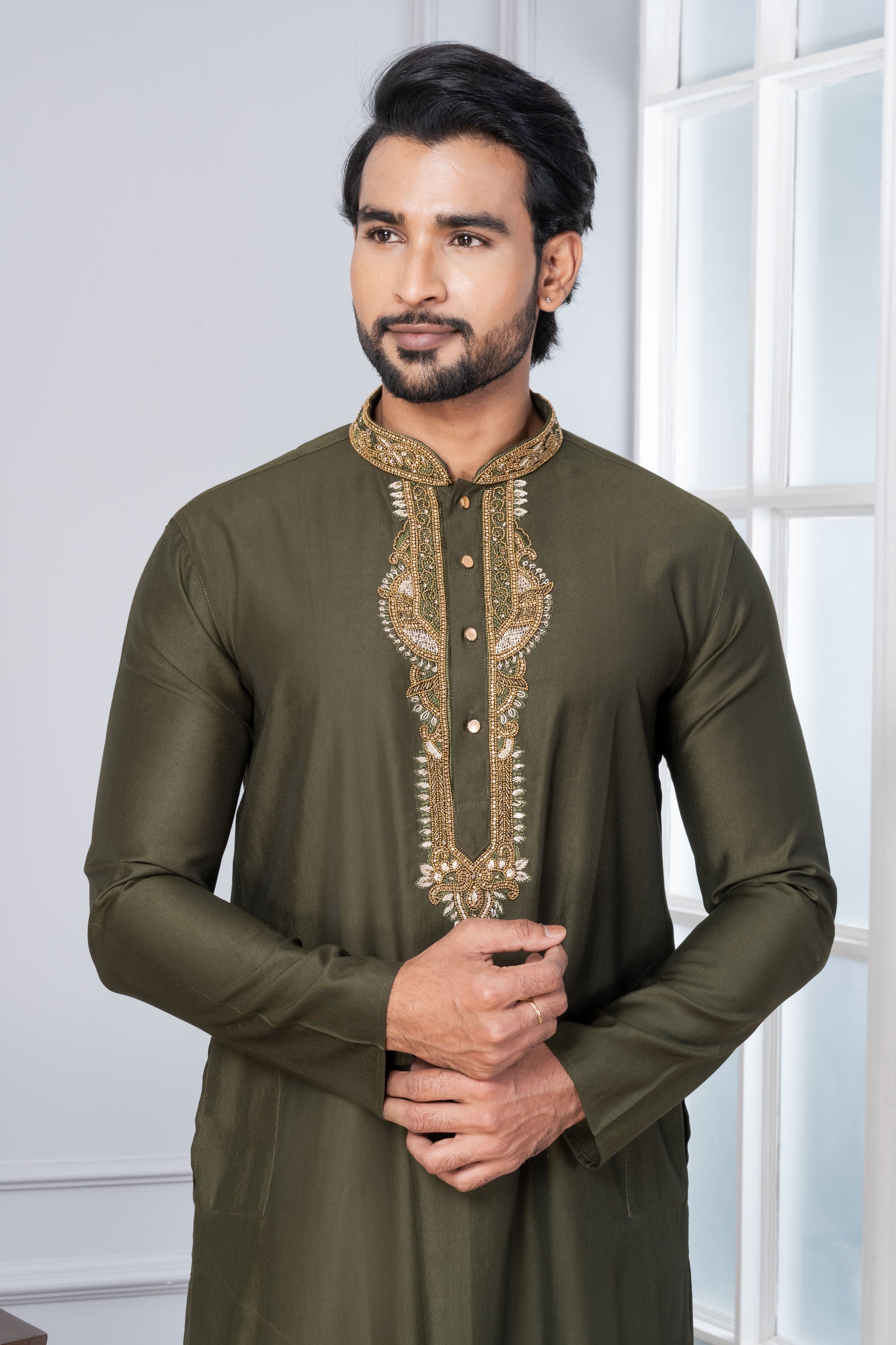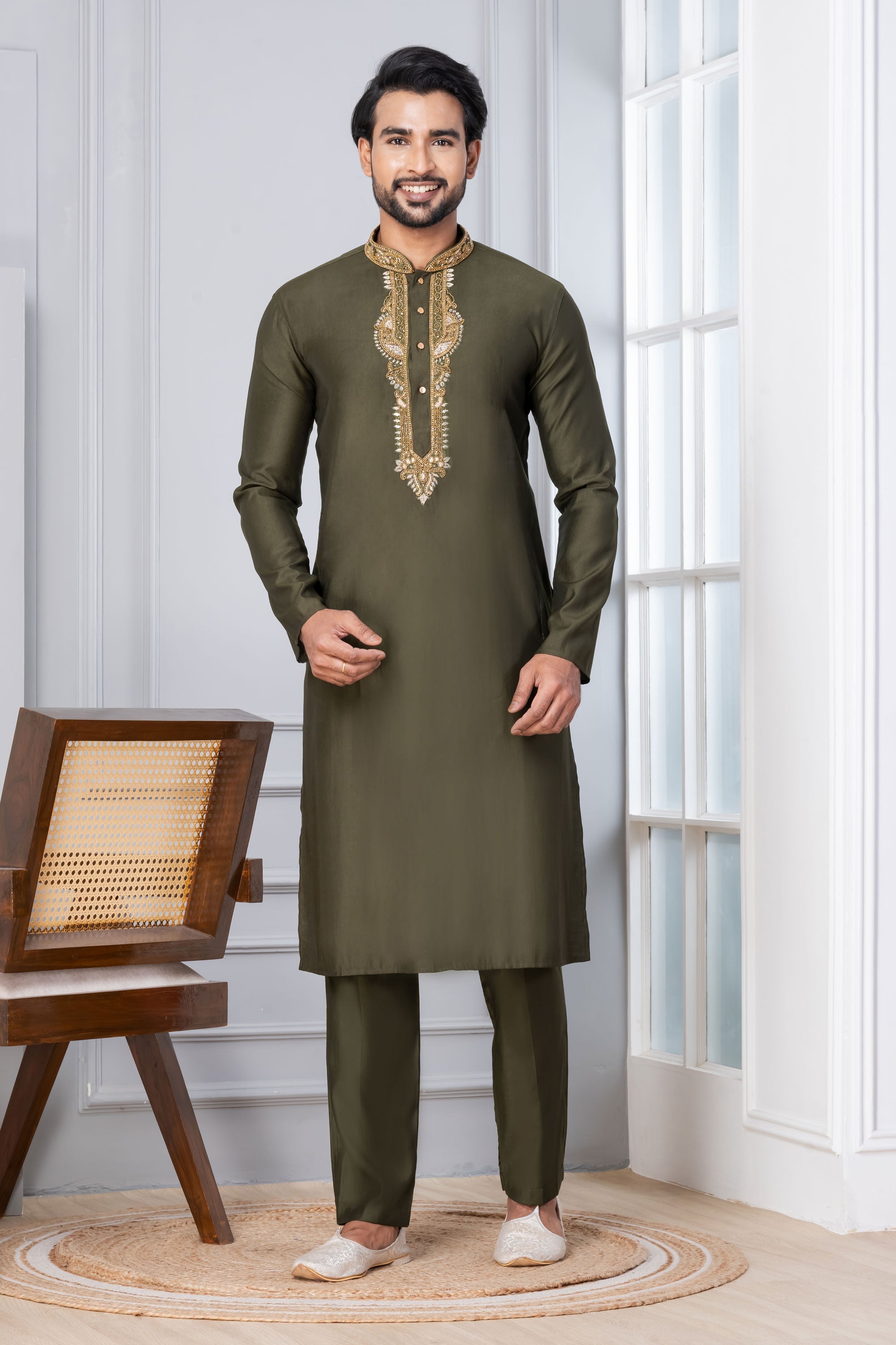 Cotton Mahendi Green Sangeet Wear Readymade Designer Men Kurta Pyjama