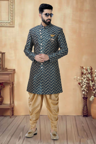 Navy Blue Jacquard Fabric Festive Wear Readymade Indo Western For Men