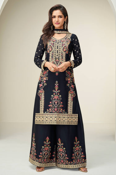 Navy Blue Chinon Silk Embroidered Readymade Palazzo Suit