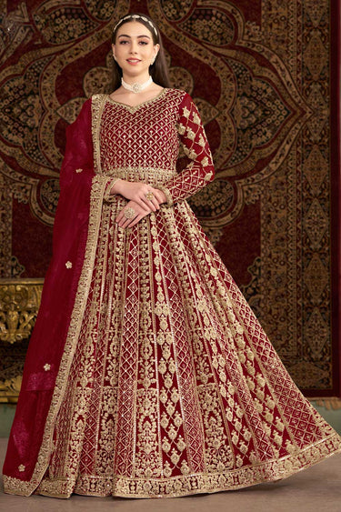 Net Fabric Maroon Color Sangeet Function Elegant Anarkali Suit