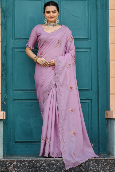 Amazing Embroidered Work On Purple Color Cotton Fabric Saree