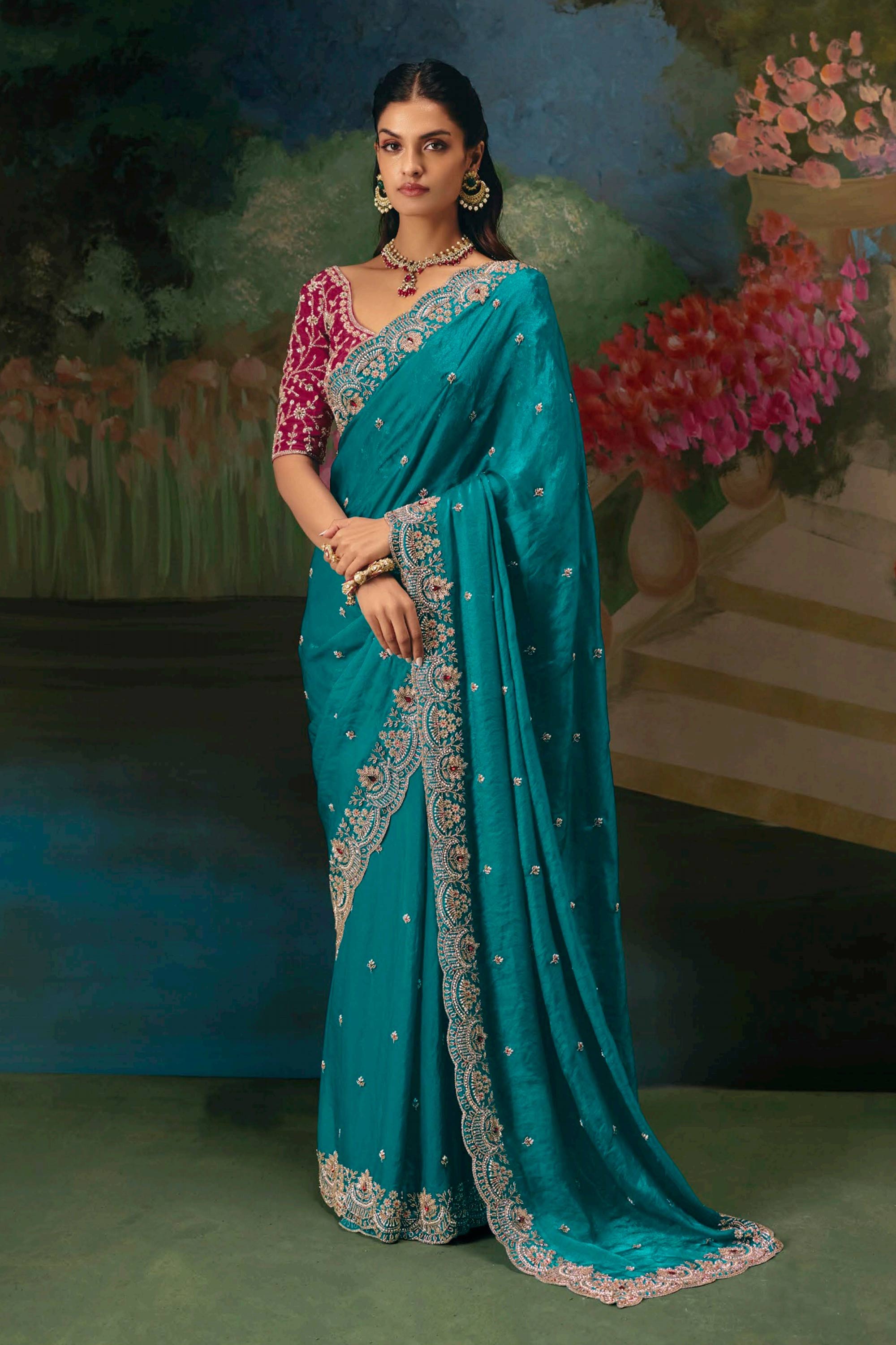 Art Silk Embroidered Teal Saree For Wedding Wear