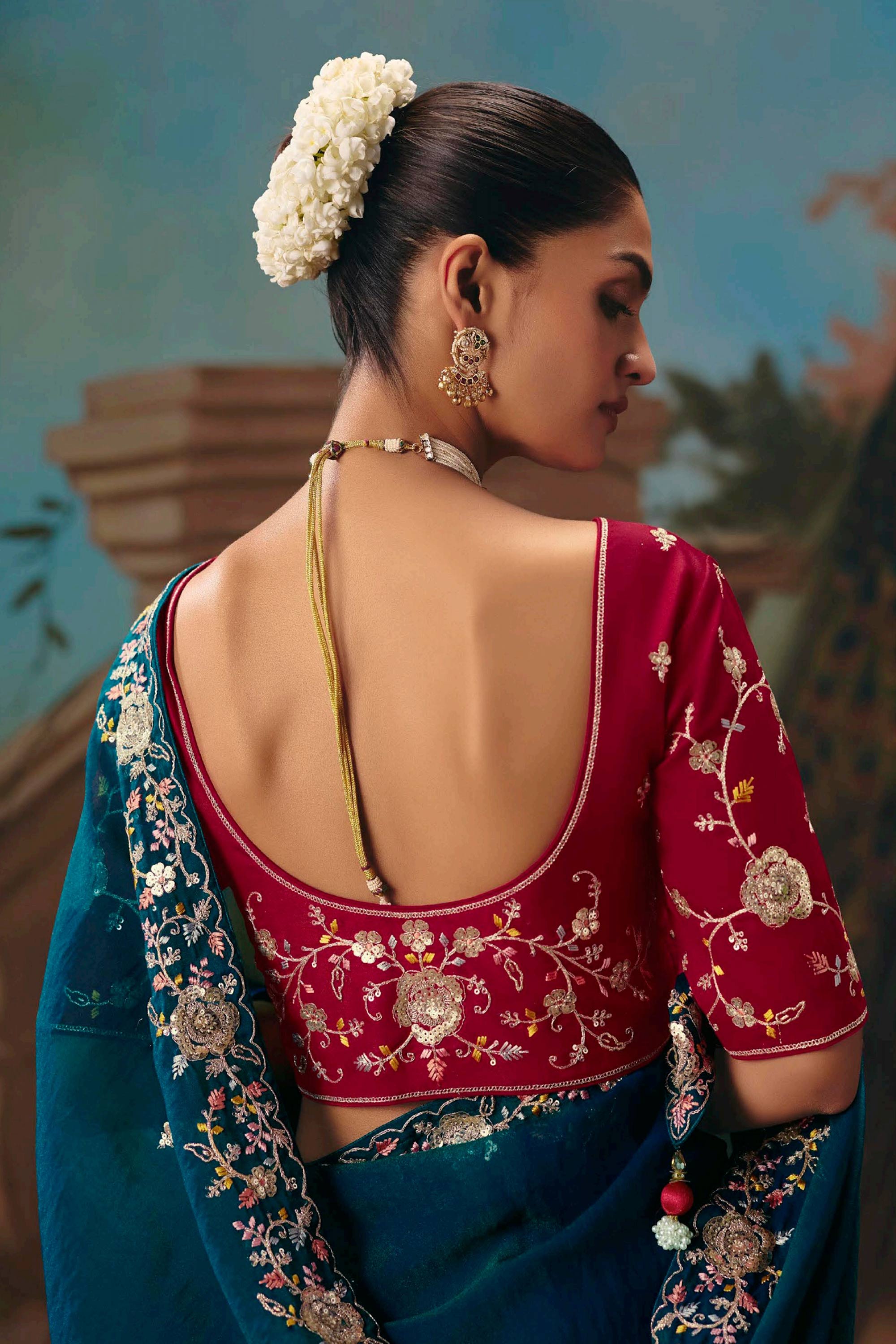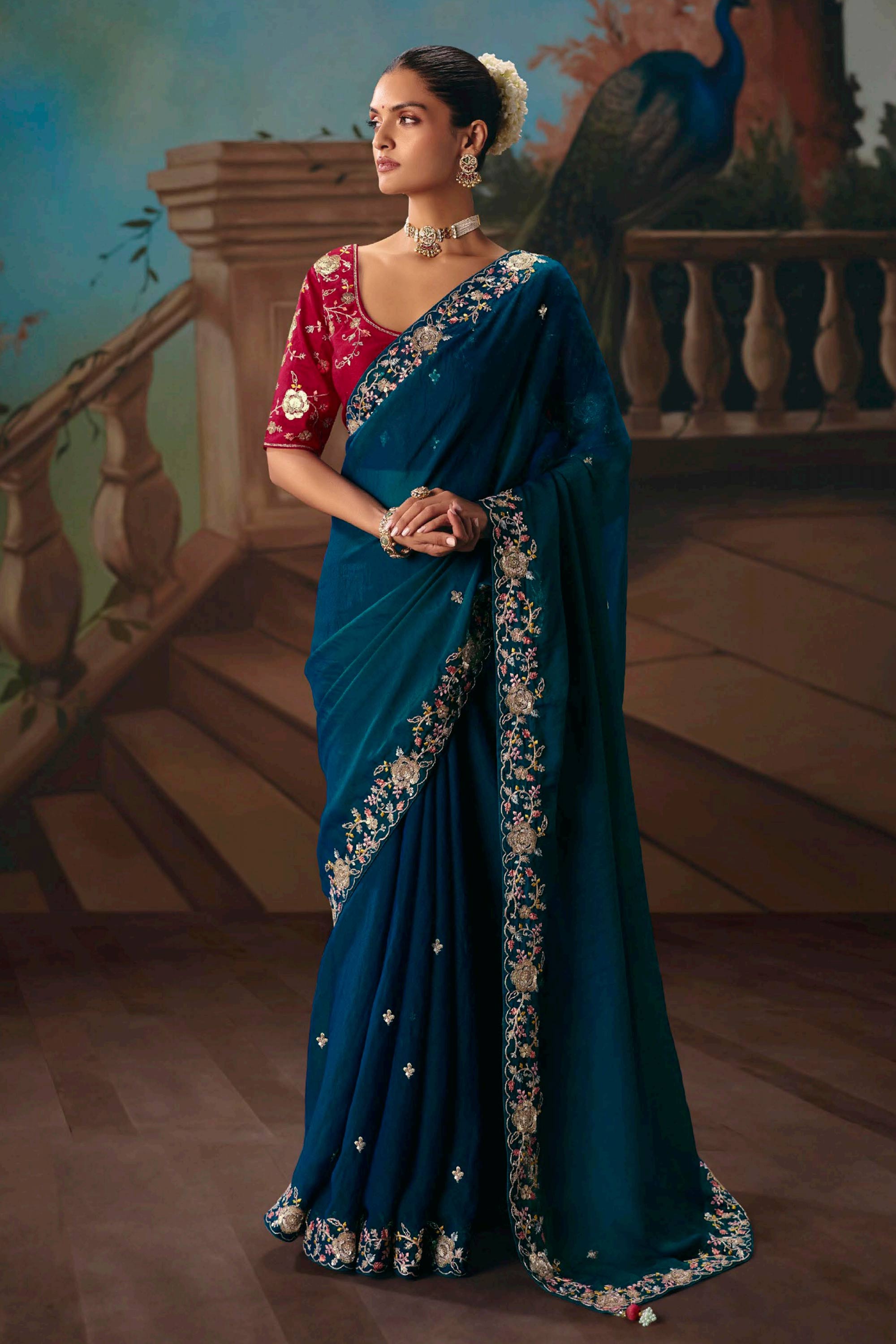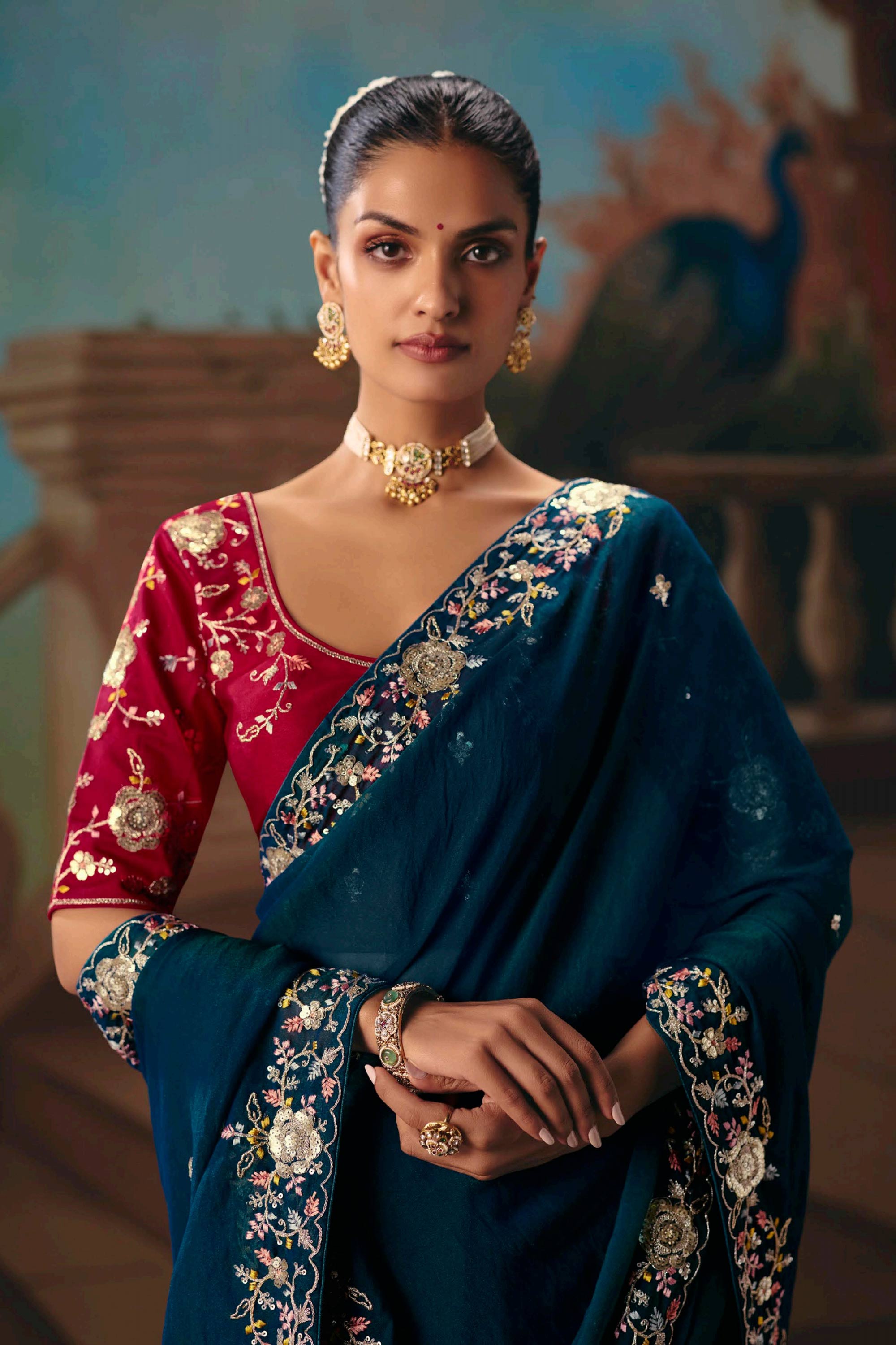 Art Silk Fabric Embroidered Blue Wedding Wear Saree