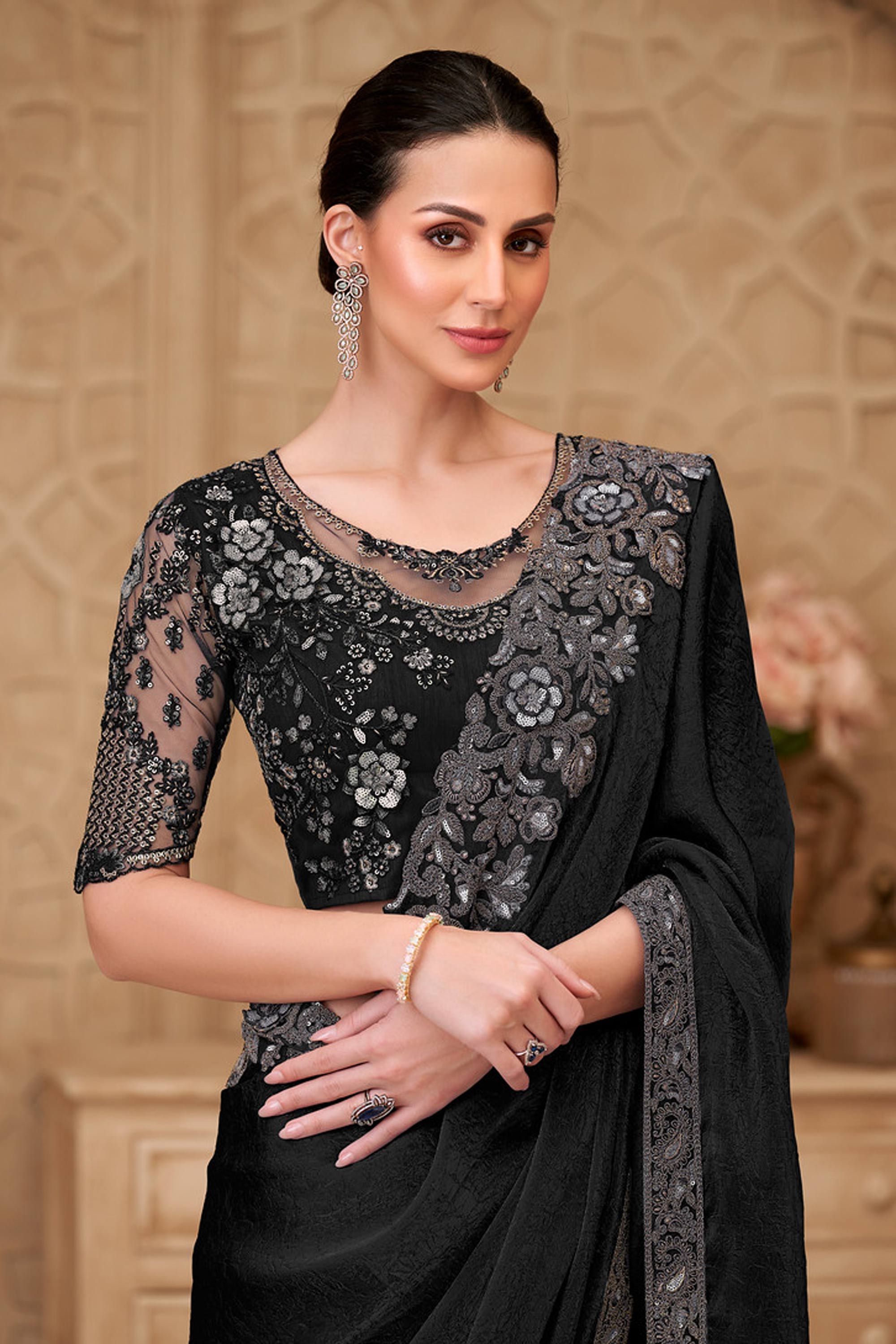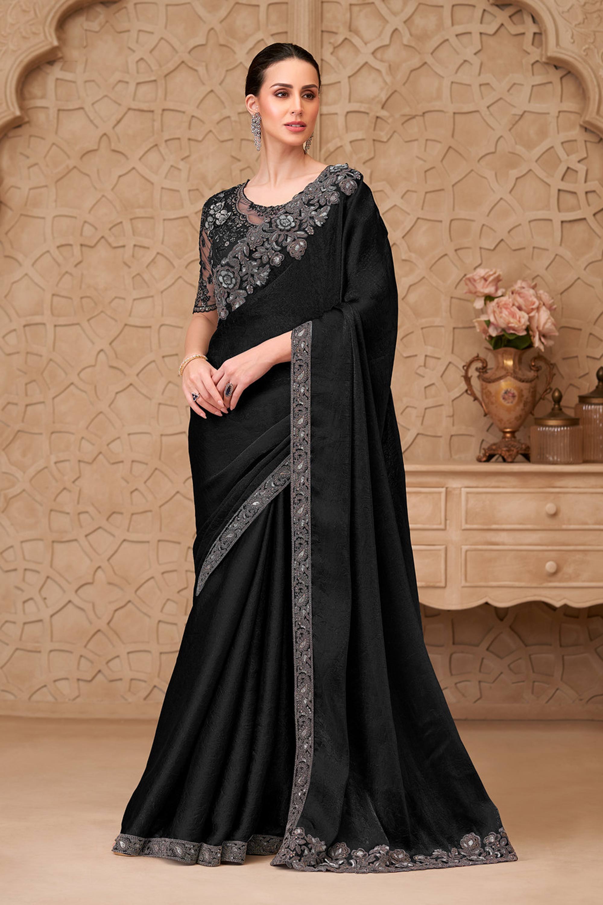 Black Georgette Satin Embroidered Festive Wear Saree
