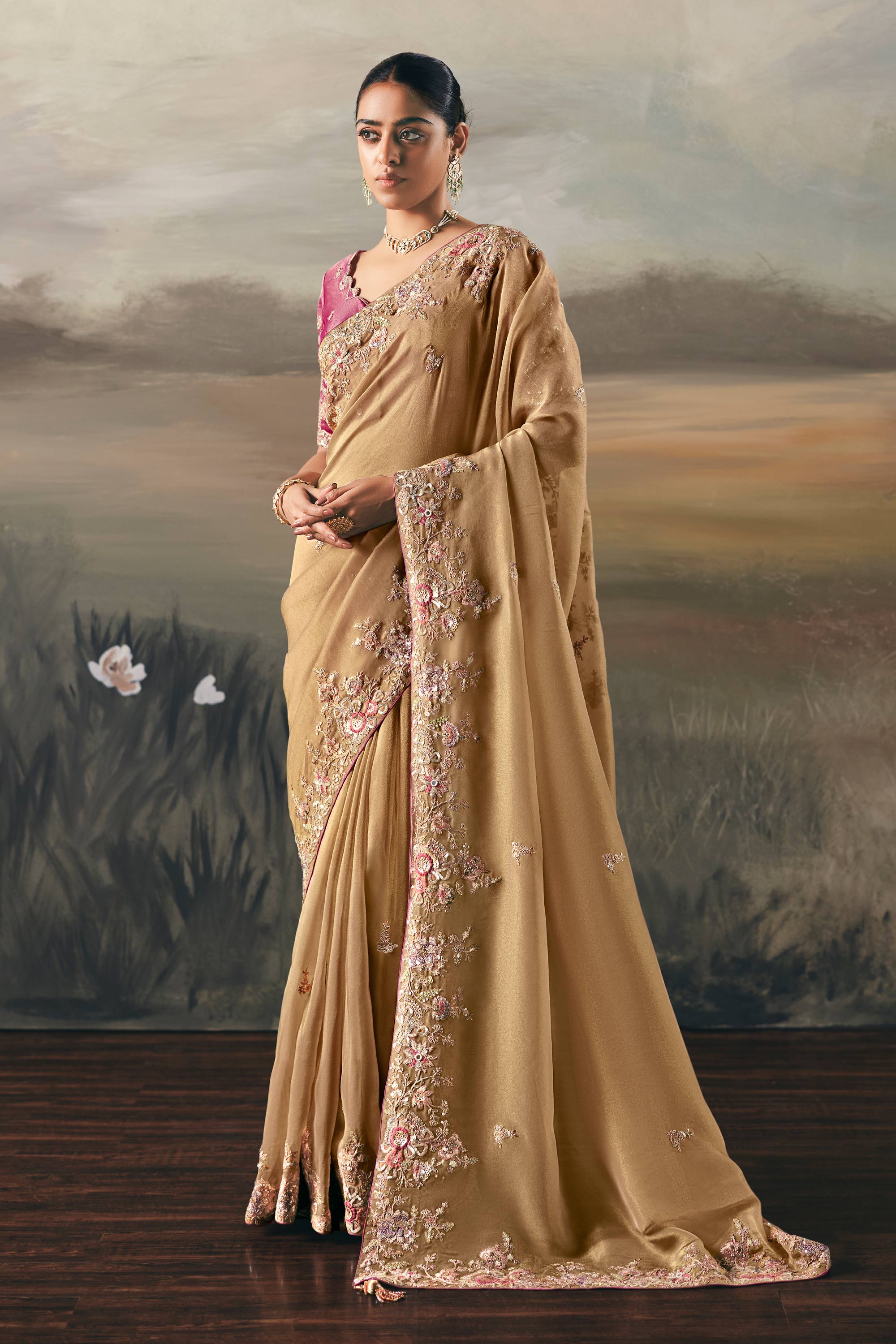 Border Work Tissue Cream Sangeet Wear Saree