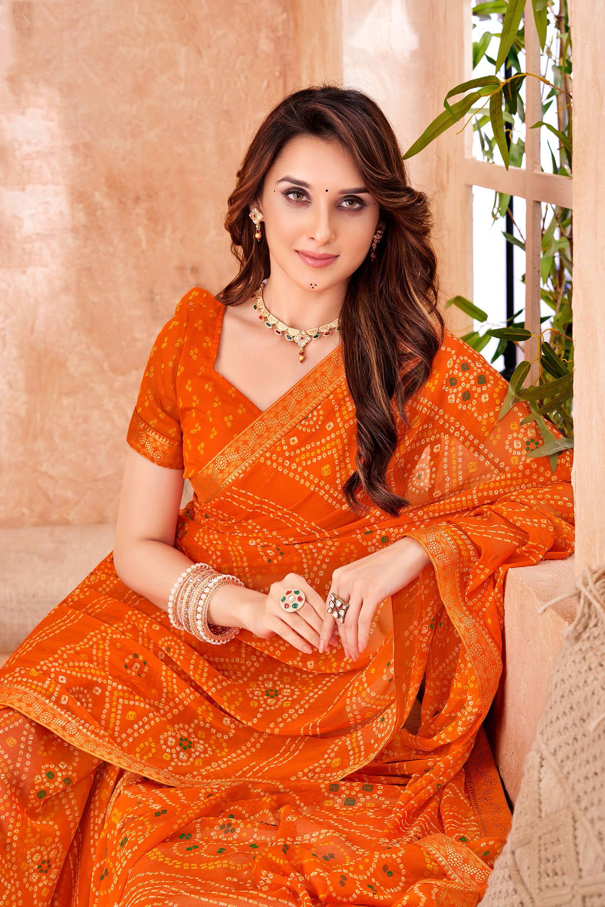 Enhance your everyday look with this vibrant Bandhej Print Chiffon Saree that comes paired with a matching blouse piece. The soft and lightweight chiffon fabric offers effortless elegance and all-day comfort. Perfect for casual or semi-formal occasions, the Bandhej print celebrates cultural heritage in a simple yet stylish way. This saree’s airy texture makes it ideal for hot weather, allowing you to stay cool and look radiant wherever you go.