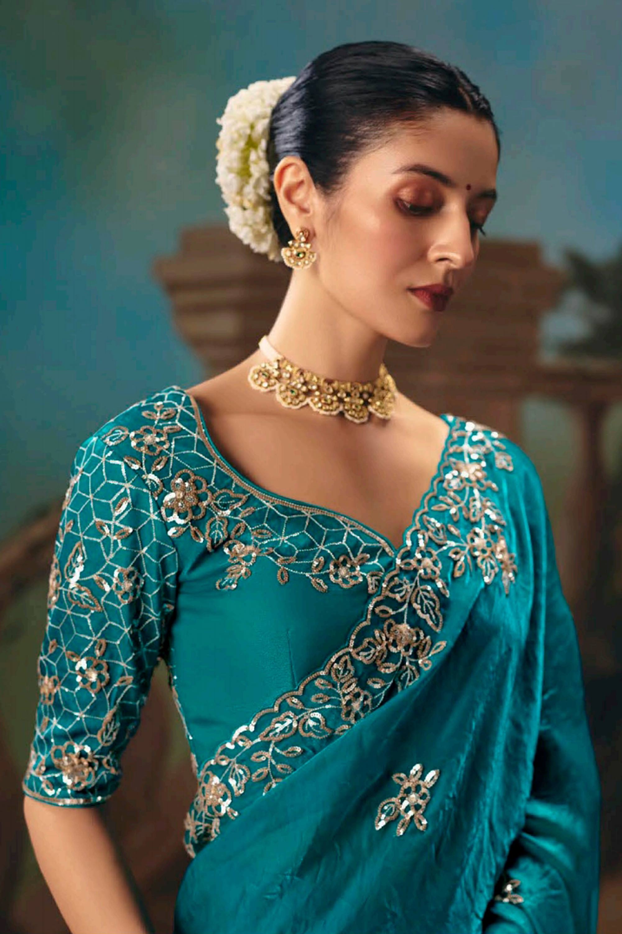 Embroidered Art Silk Fabric Teal Saree For Wedding Wear