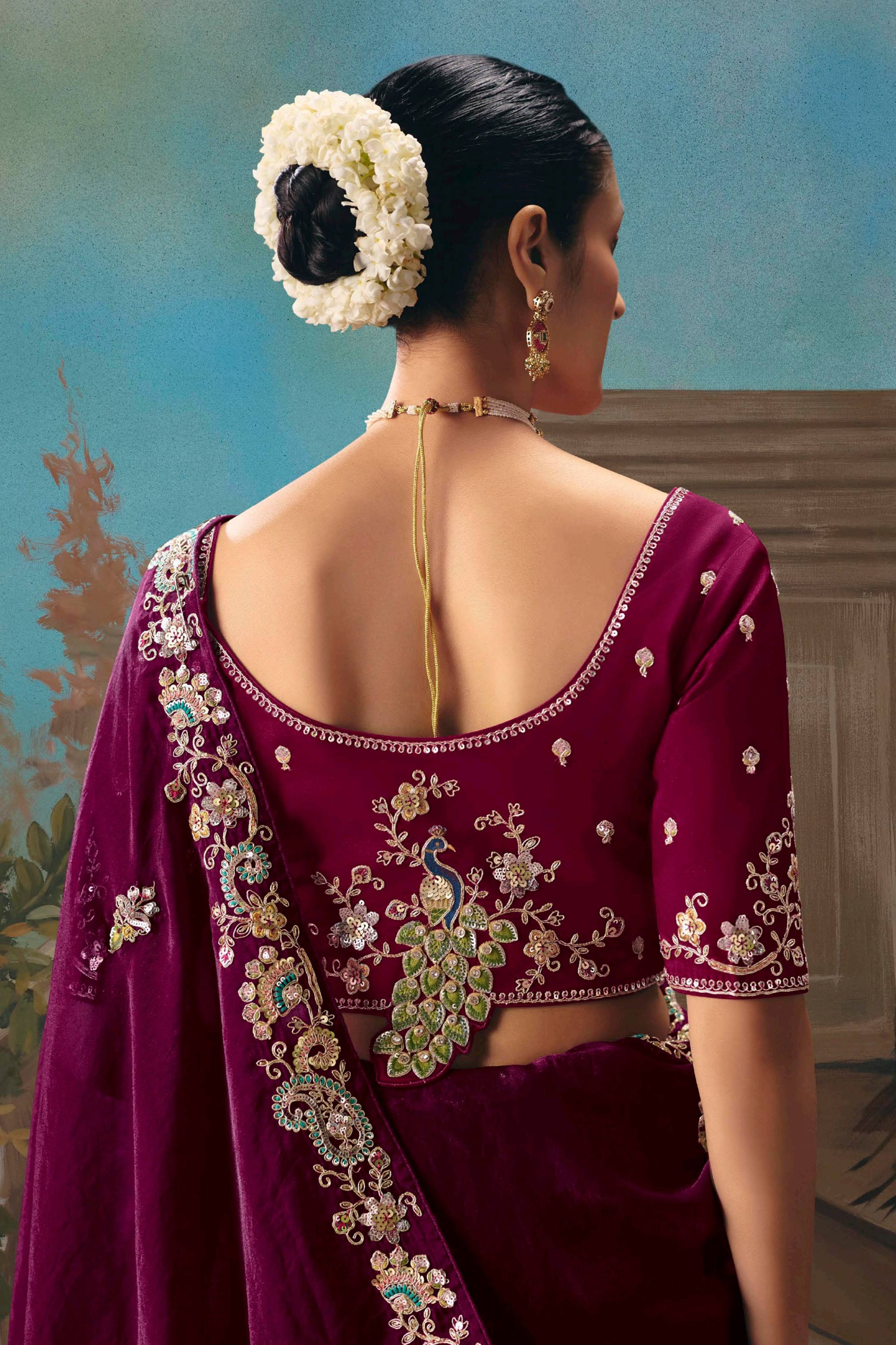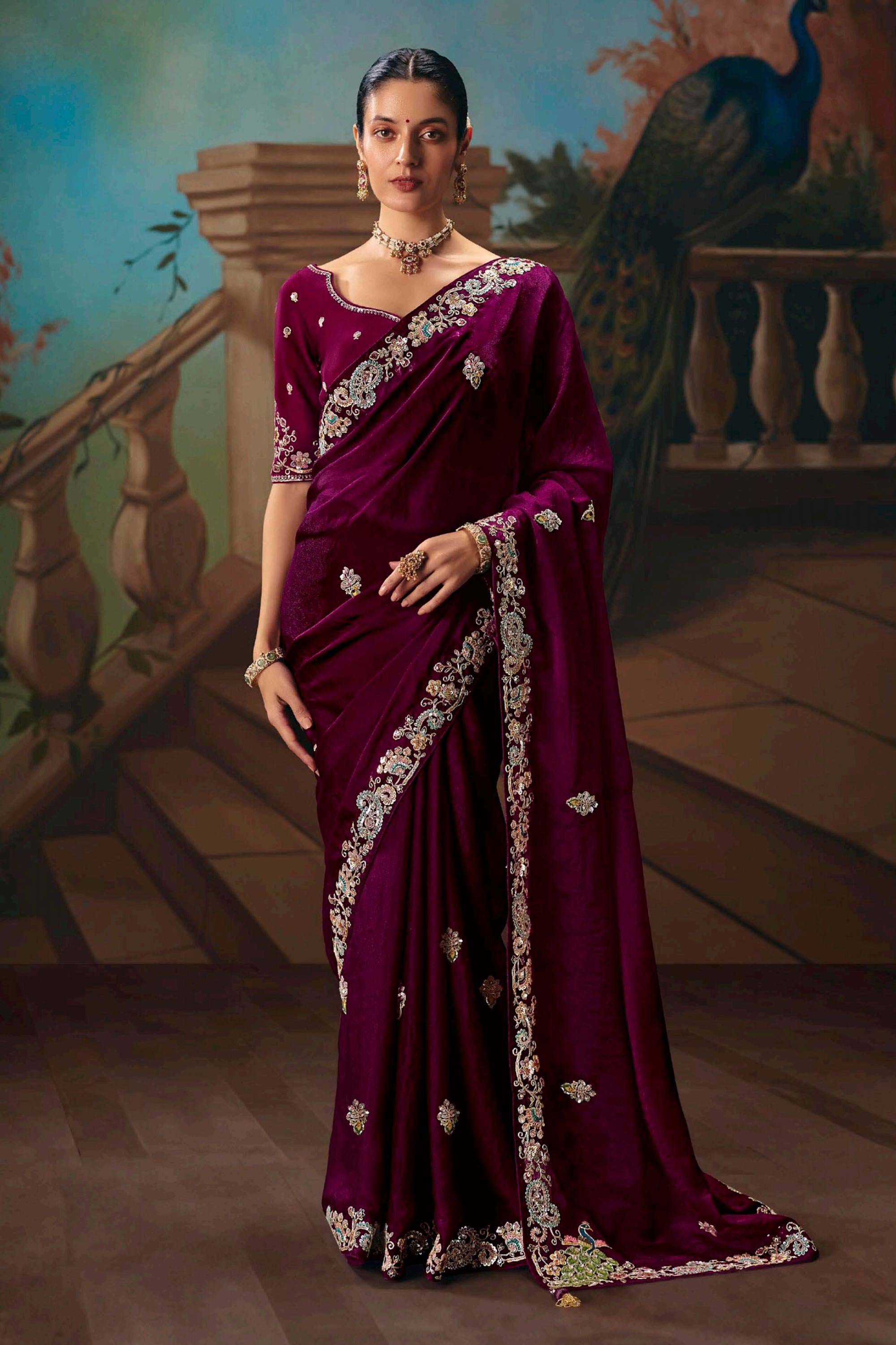 Wine Art Silk Embroidered Wedding Wear Saree
