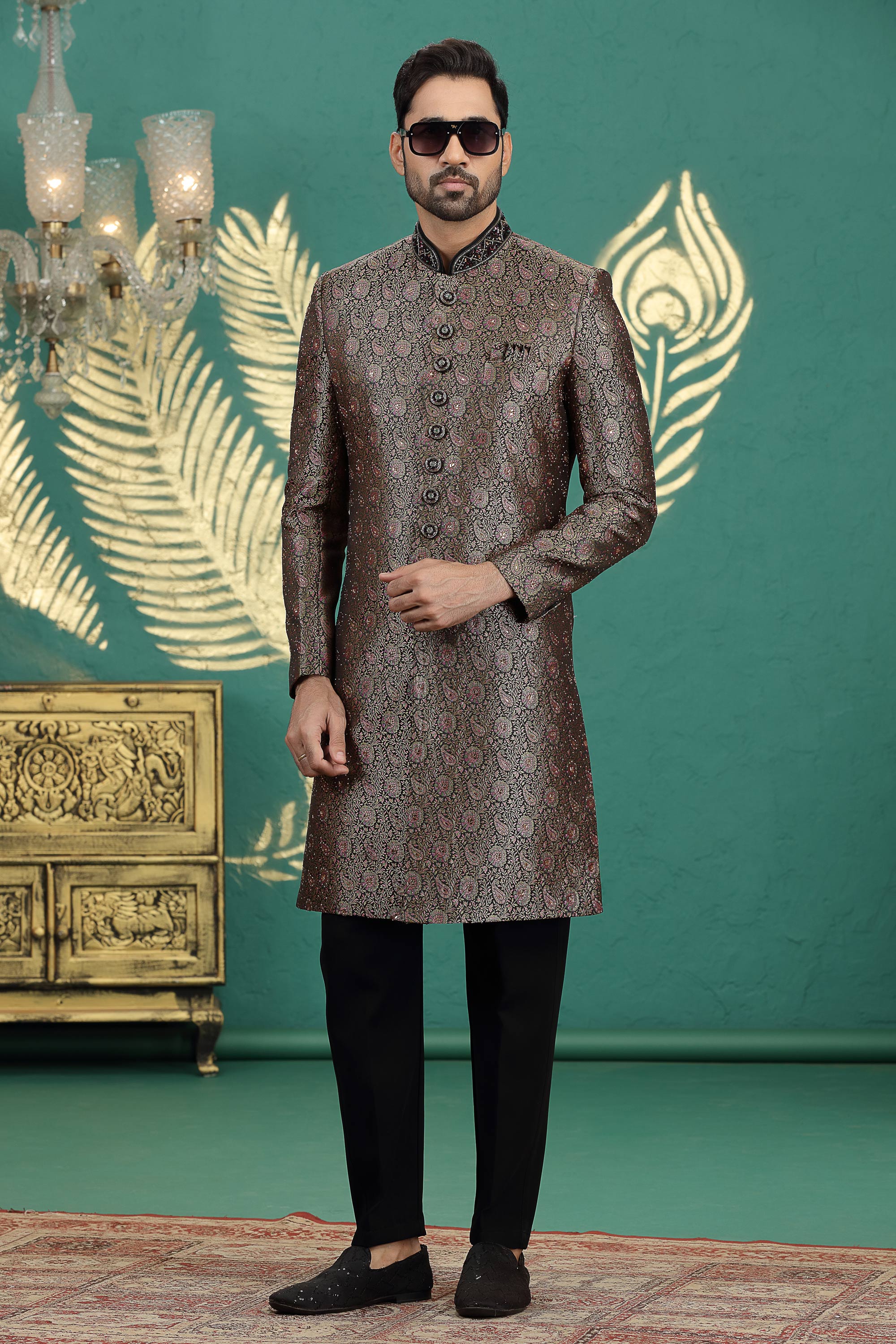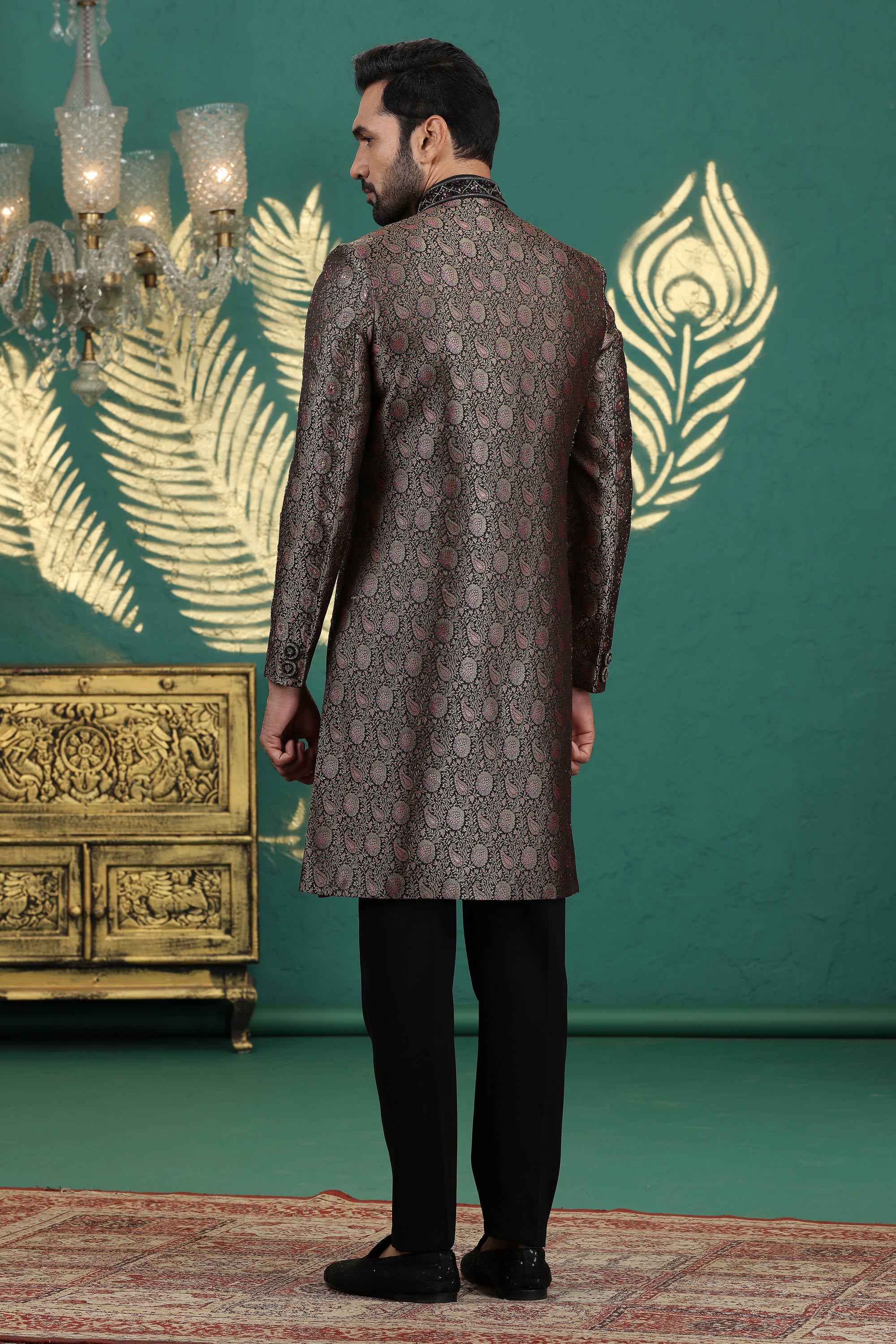Banarasi Jacquard Stunning Black Wedding Wear Readymade Men Sherwani