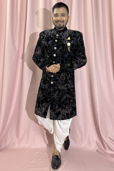 Black Velvet Fabric Graceful Readymade Men Indo Western For Wedding Wear