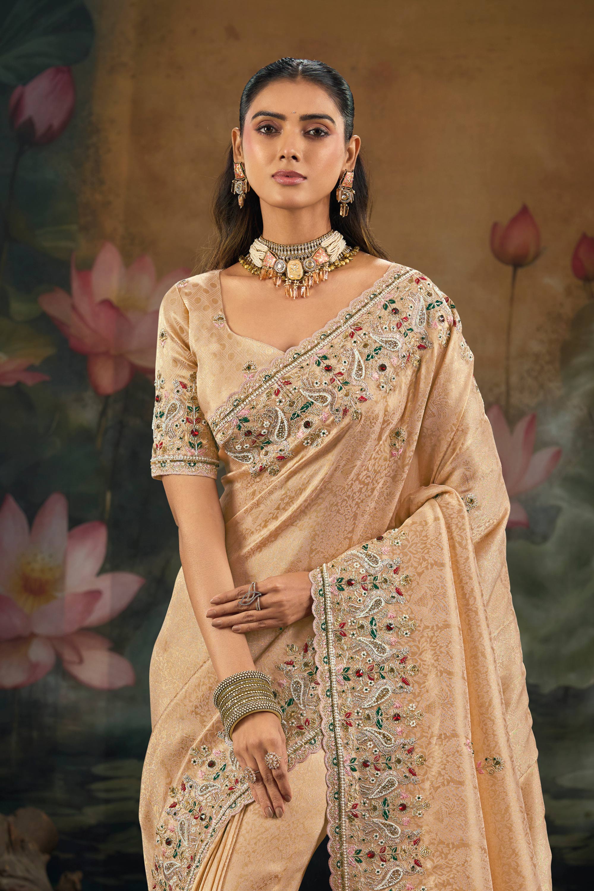 Embroidered Silk Fabric Peach Sangeet Wear Saree