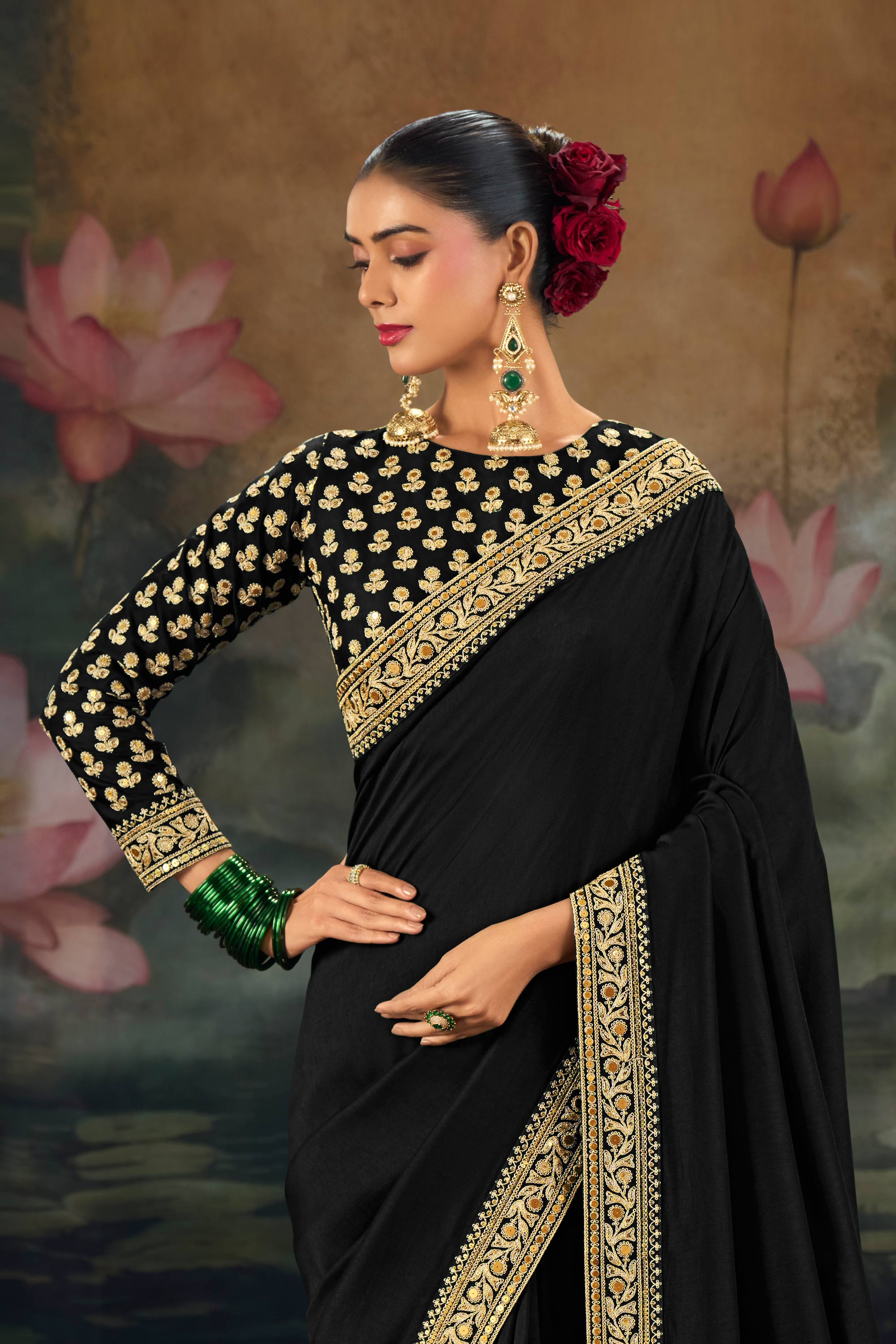 Silk Fabric Embroidered Black Sangeet Wear Saree