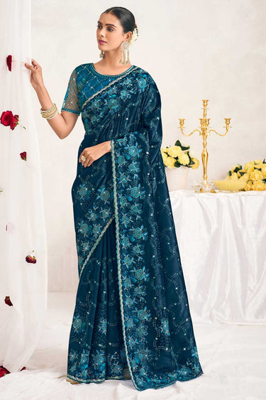 Tempting Silk Fabric Teal Color Saree With Embroidered Work