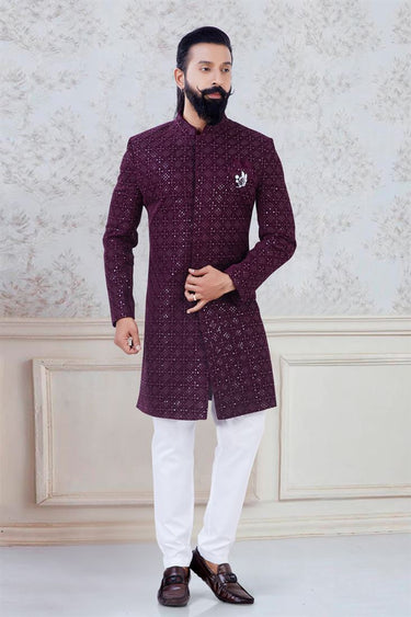 Striking Wine Velvet Fabric Wedding Indowestern For Men
