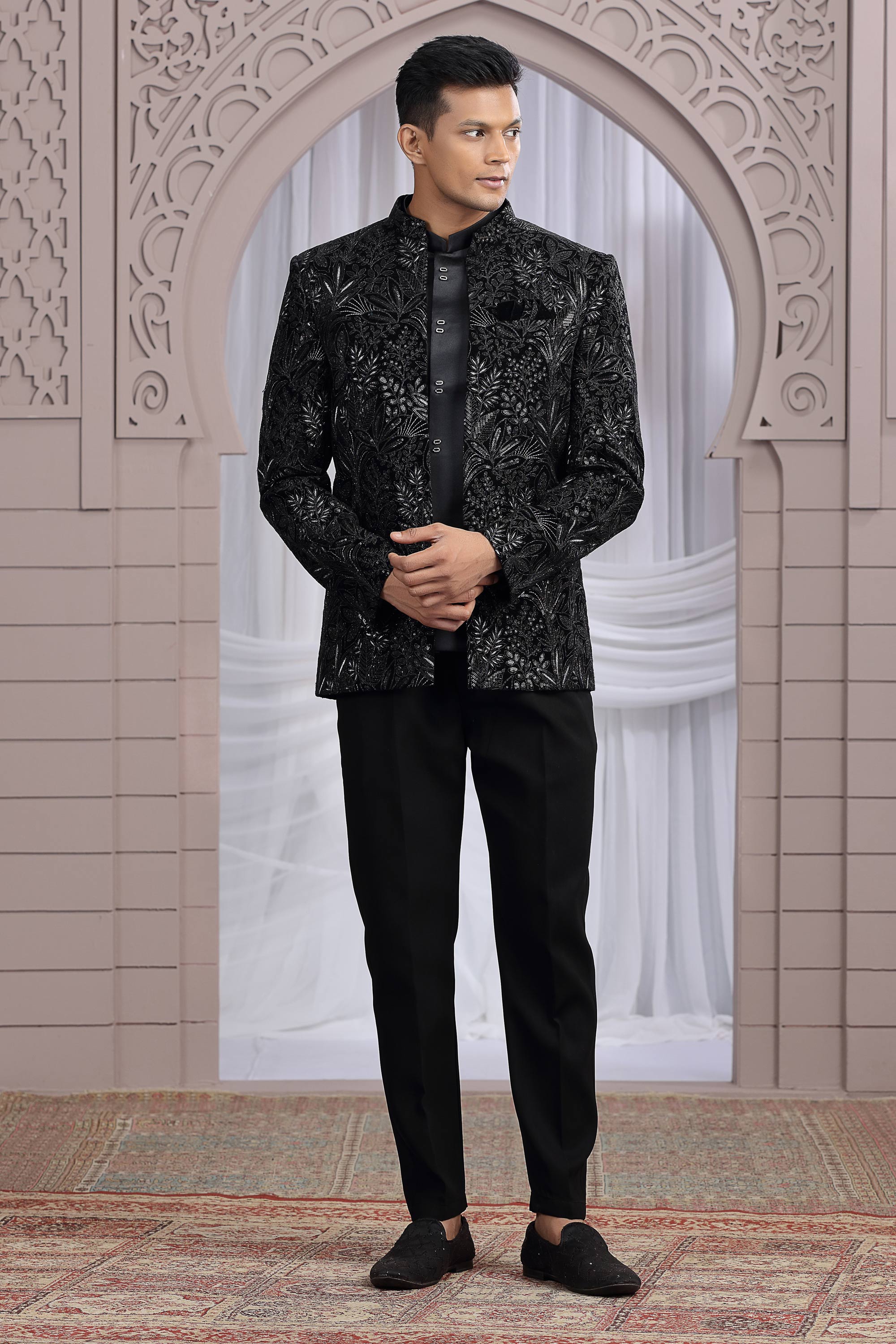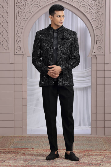 Velvet Black Wedding Wear Readymade Glamorous Indo Western Jodhpuri Suit For Men