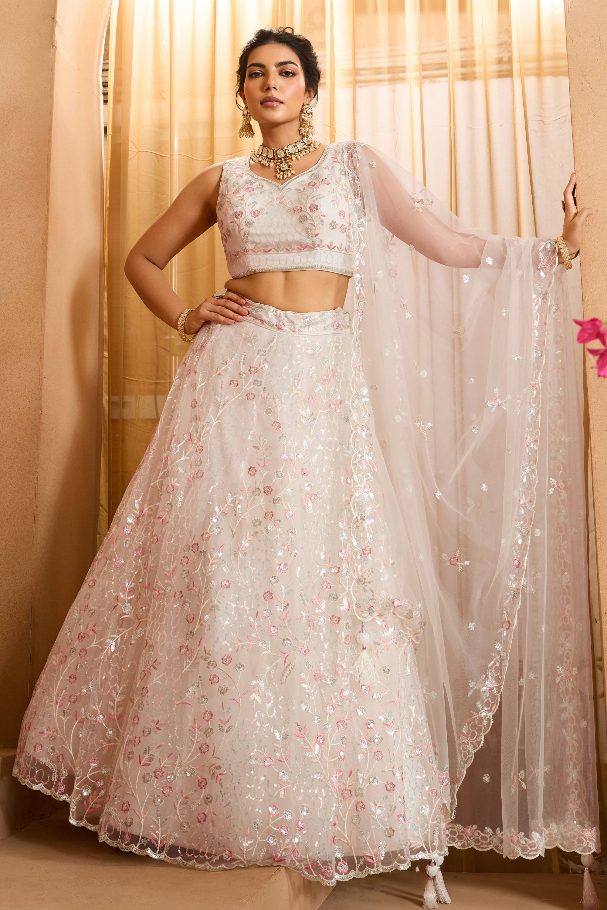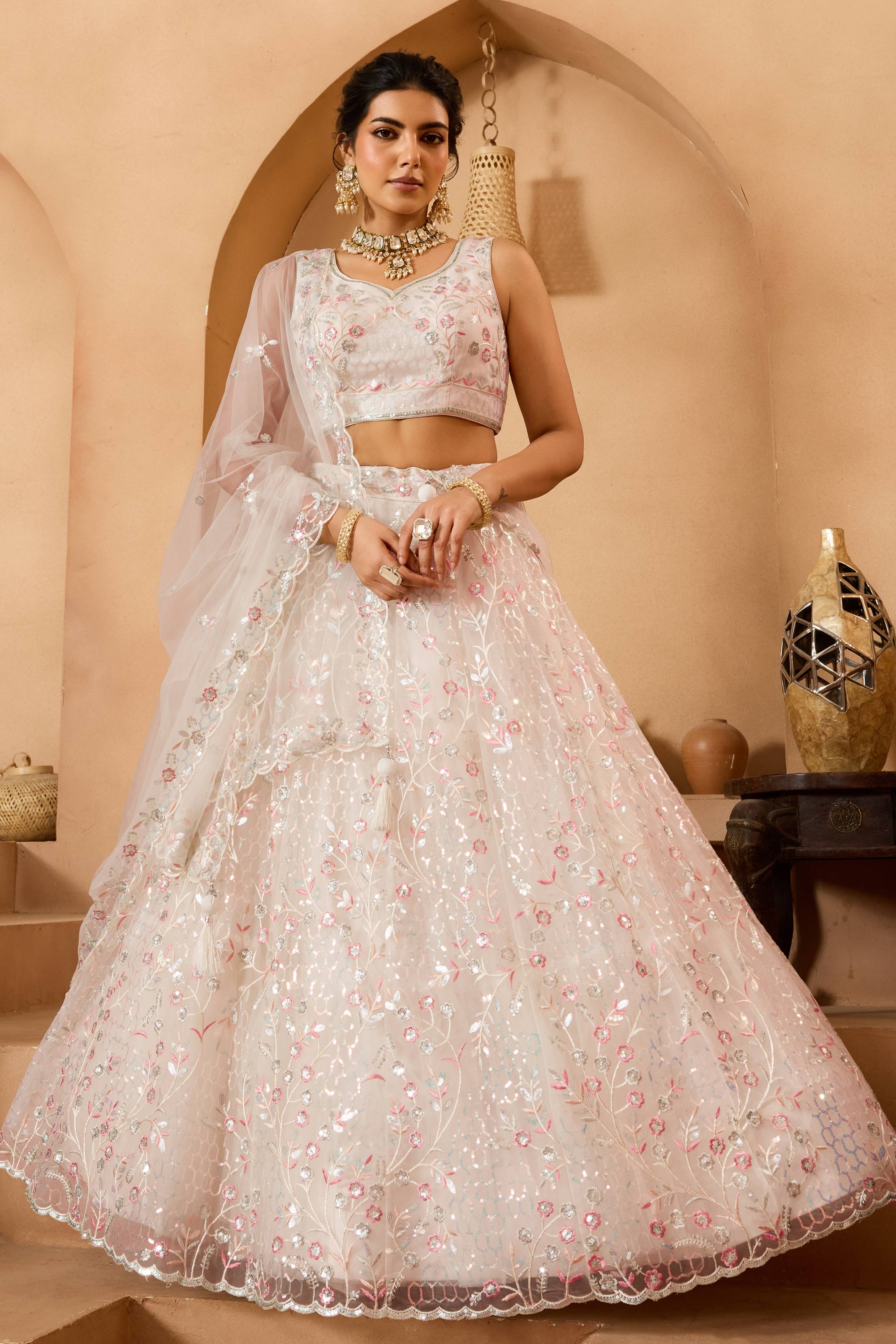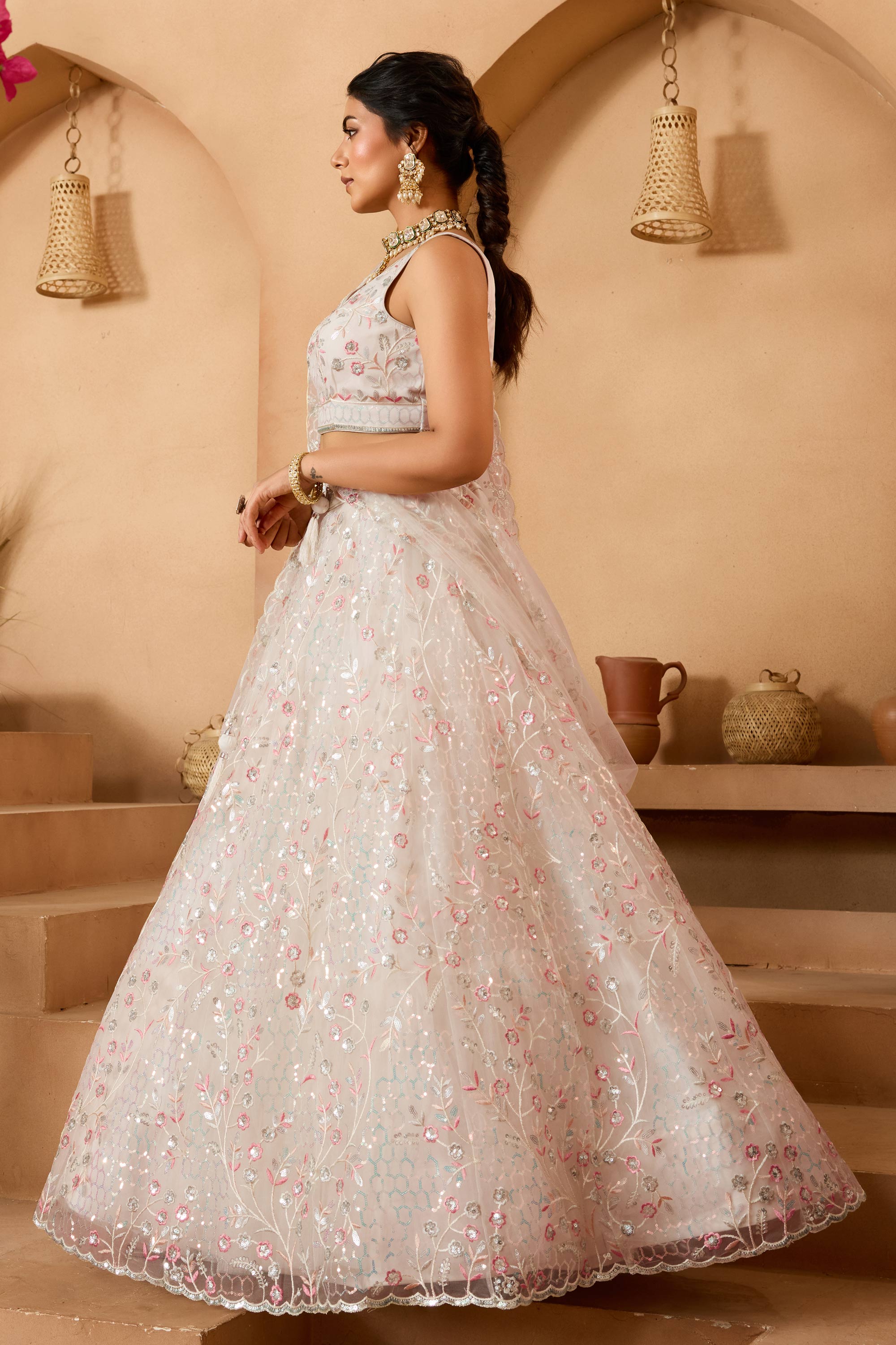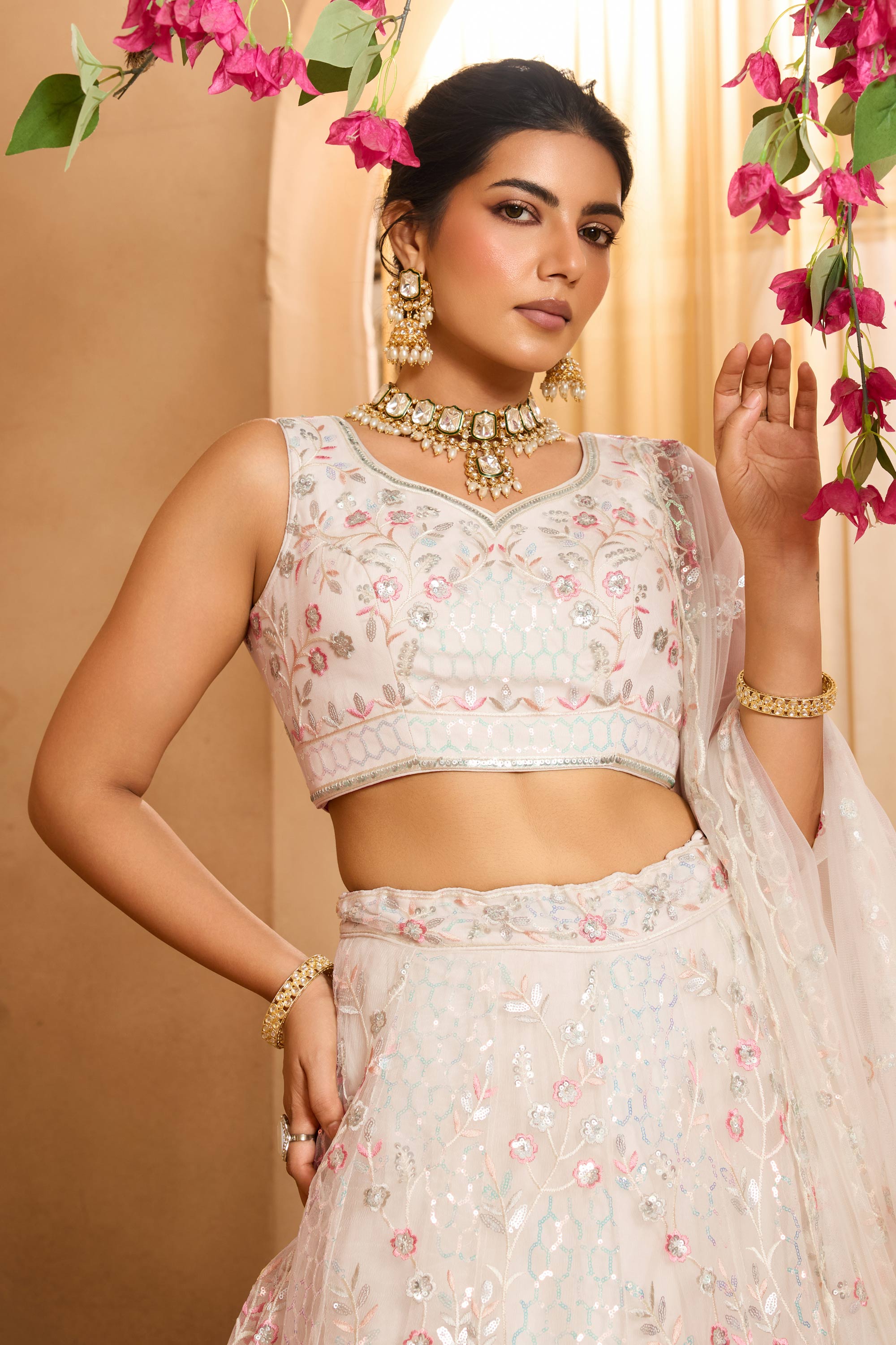 Net Fabric Embroidered Cream Wedding Wear Lehenga Choli