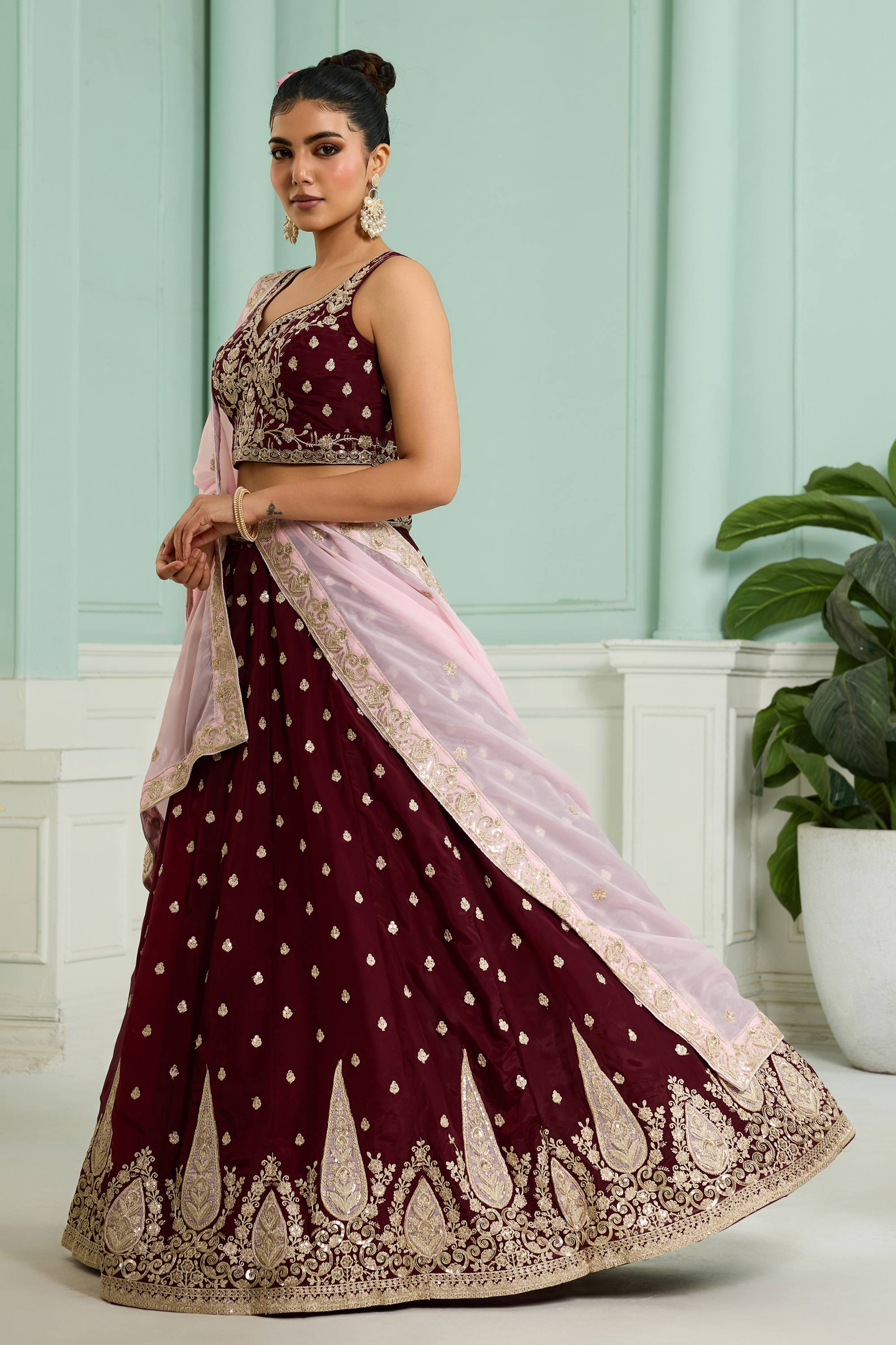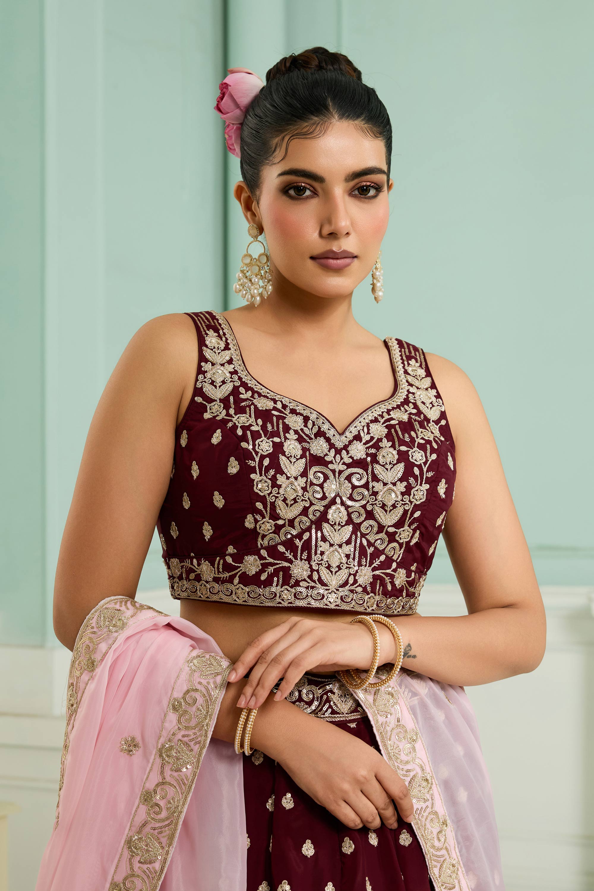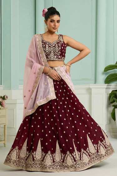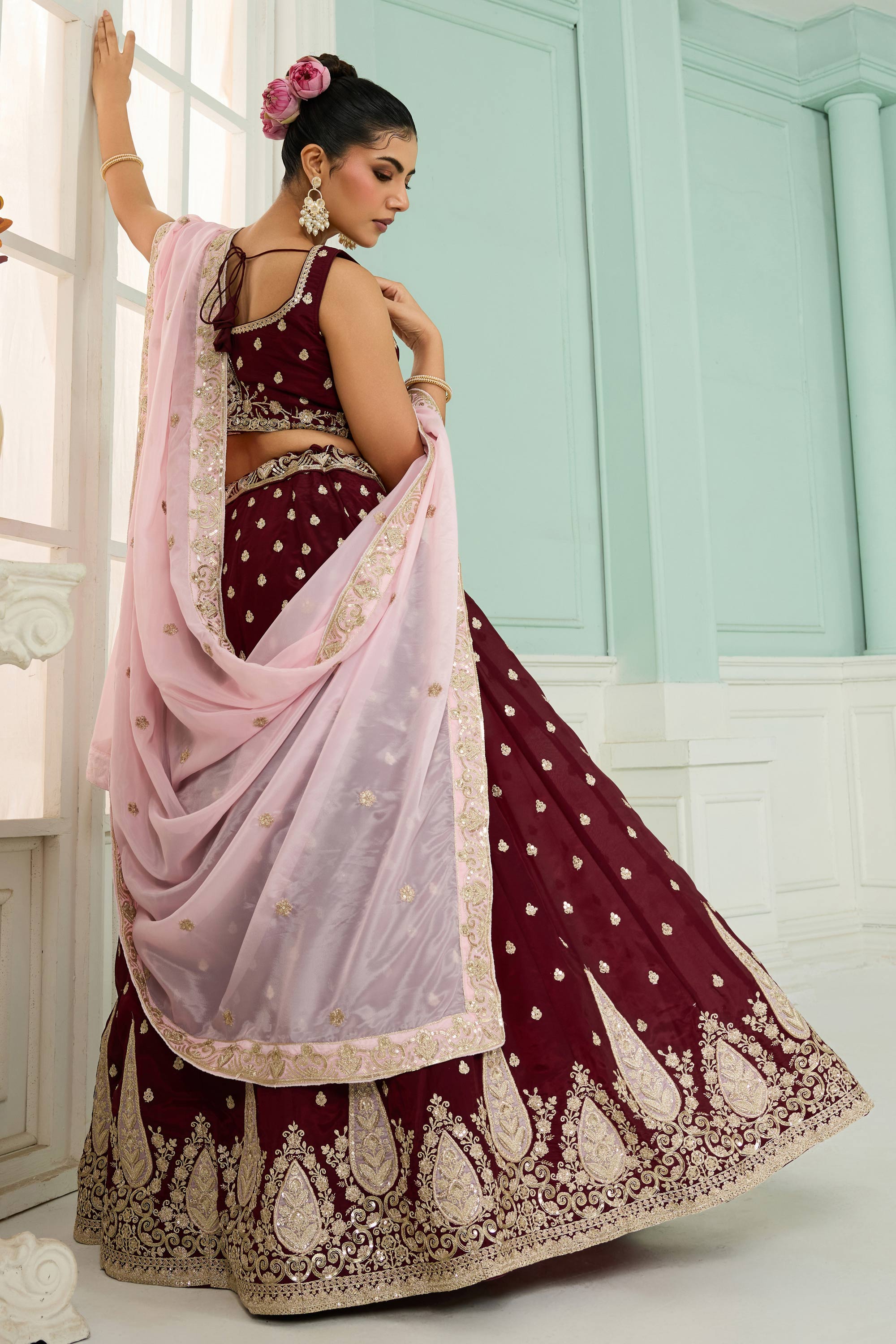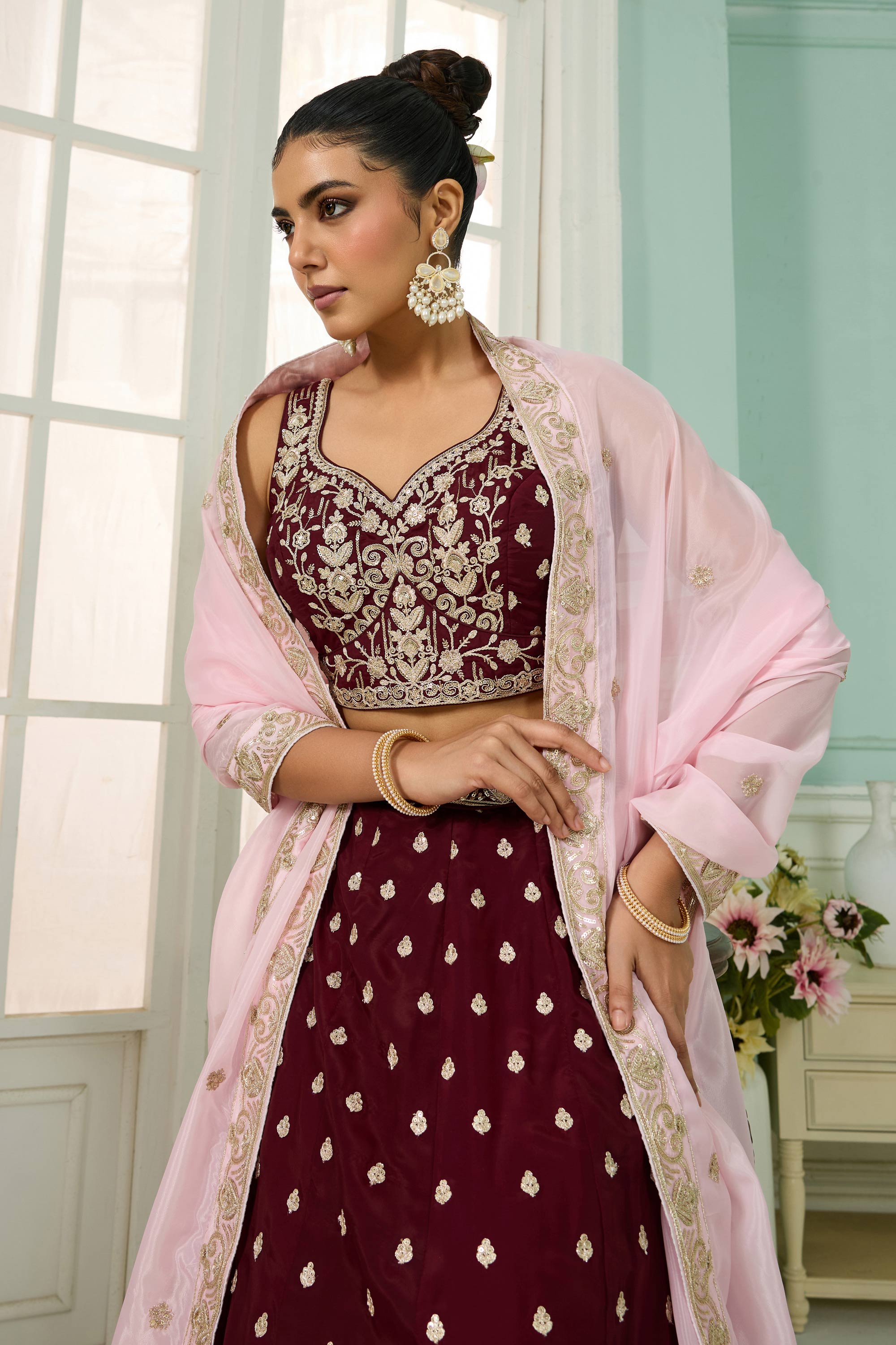 Organza Fabric Maroon Wedding Wear Lehenga Choli With Dupatta